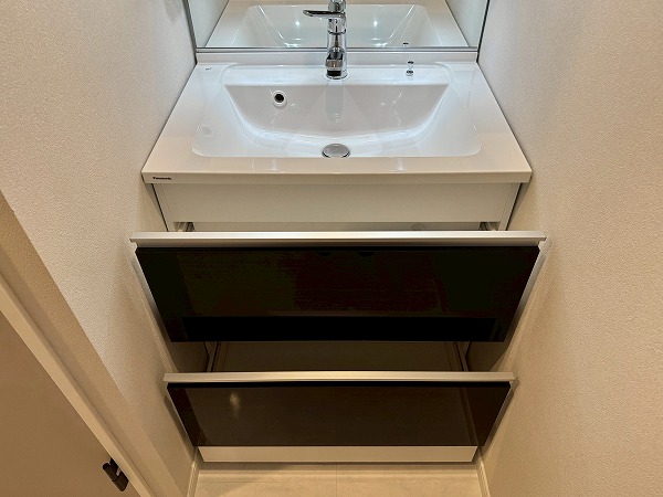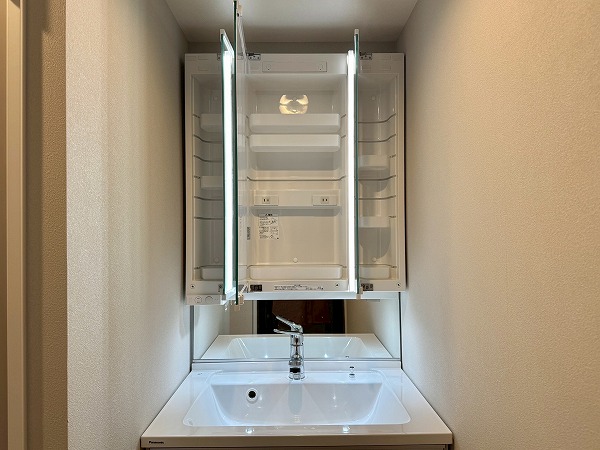 生活のリズムを整えてくれる、まとまりのある水まわり空間。洗面・トイレ・バスルームが一体となり、朝の支度から夜のリラックスタイムまでを自然に繋ぎます◎洗面化粧台は3面鏡仕様で収納力も抜群ですよ♩