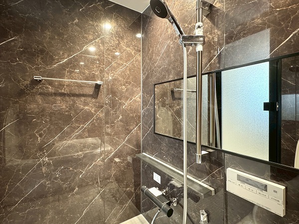 バスルームは、空間全体を彩るタイル使いが印象的な、ホテルライクなデザイン♥追い焚き機能に加え、浴室乾燥機も完備。時間や天候に左右されることなく、快適さを保てる設備が整っています。