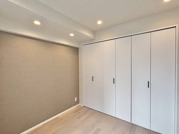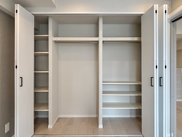 洋室には壁一面の大きなクローゼットが!可動棚を備えたシステム収納になっており、衣類や小物を種類ごとに整理可能。どこに何があるか一目で分かるので、忙しい朝の身支度もスムーズに行えるのではないでしょうか。