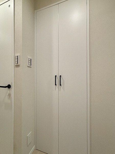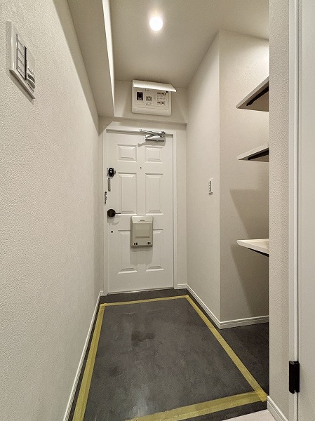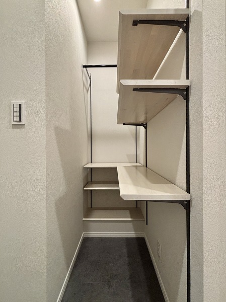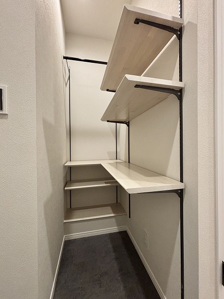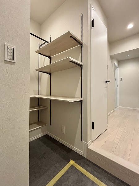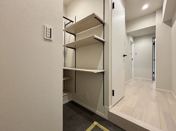 今回のお部屋の魅力の1つが、豊富な収納スペースです。玄関の左手には大容量のシューズインクローゼットを完備。棚板は高さを自由に調整できる可動式で、ロングブーツやハイヒールも美しく整理できますよ♥