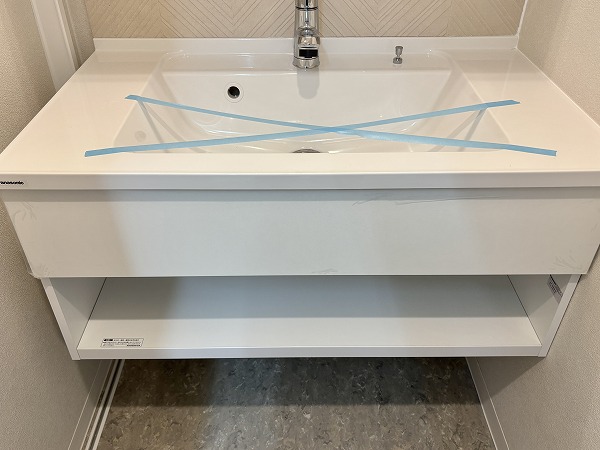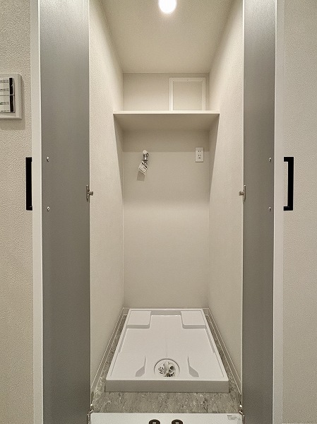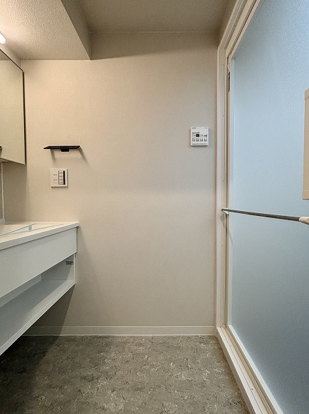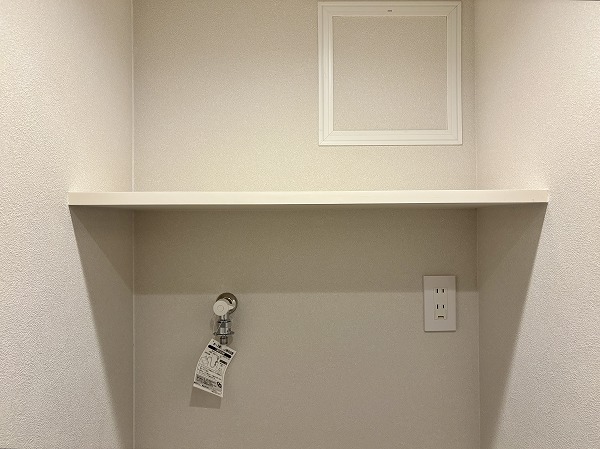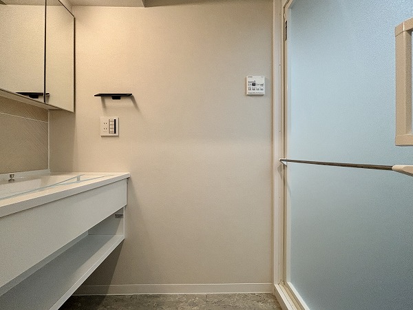 サニタリールームは洗面化粧台、脱衣スペース、バスルームに絞ったシンプルな構成。洗面化粧台の下にはちょっとした収納スペースがあり、タオルや日用品を置いておけば濡れた手でもすぐに取り出せる便利さがあります。洗濯機置き場は玄関から続く廊下沿いに設置され、サニタリールームからもすぐアクセス可能。