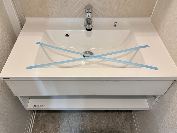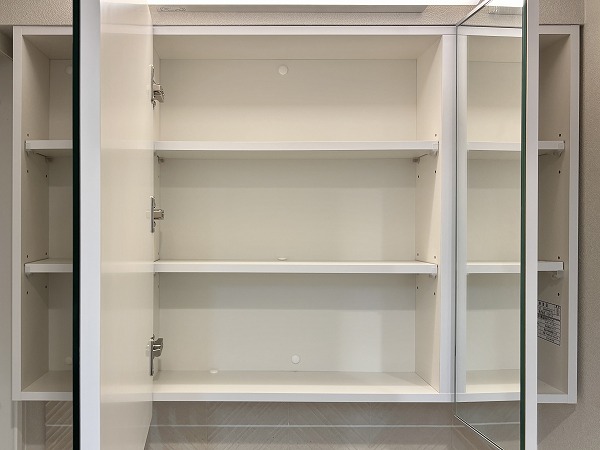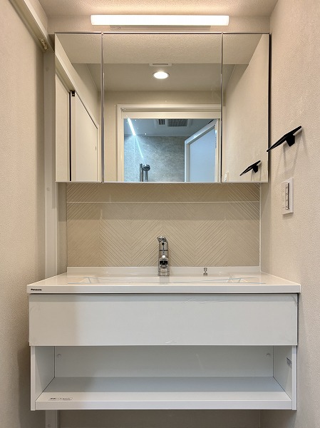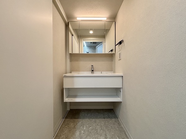 サニタリールームは洗面化粧台と脱衣所のみのシンプルな空間。洗濯機置き場のすぐ傍にサニタリールームへのドアがあるので、お洗濯はスムーズに行えるはず。タイル調のデザインがオシャレな洗面化粧台は、鏡の角度が変えられる3面鏡タイプ♡お顔をチェックしやすく、メイクやヘアセットがしやすいと人気なんですよ✨