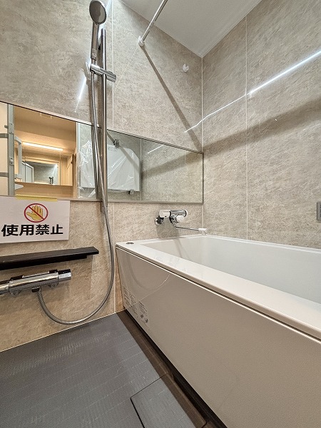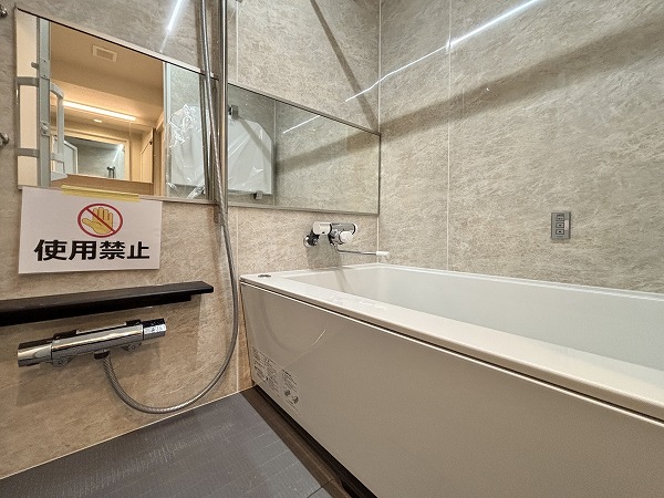 木目風のパネルが優しい雰囲気を醸し出してるバスルームへ…♩縦に長いミラーが付いていて、立っている時もお顔やお体を確認しやすいですね。インペリアル赤坂フォーラムはマンション内で一括してお湯を温めるセントラル給湯を採用しています。すぐにお湯を利用できるので、寒い冬も快適にご入浴いただけるはず✦