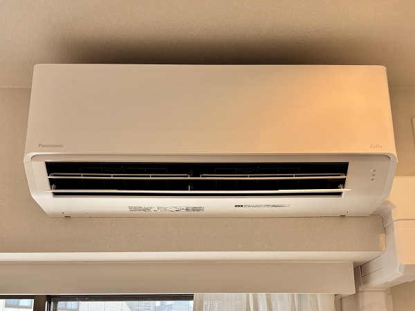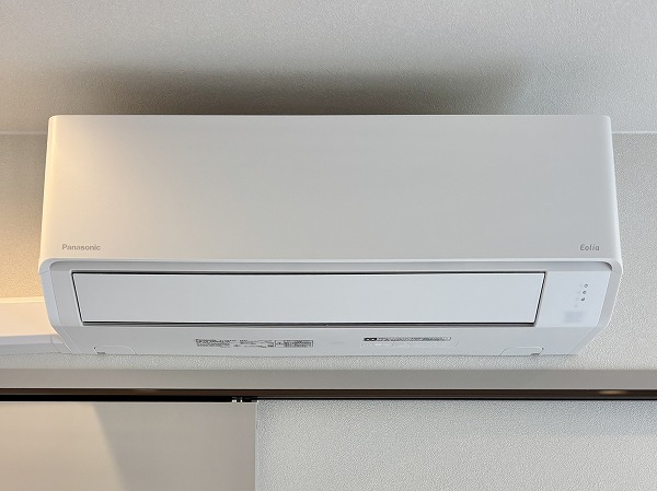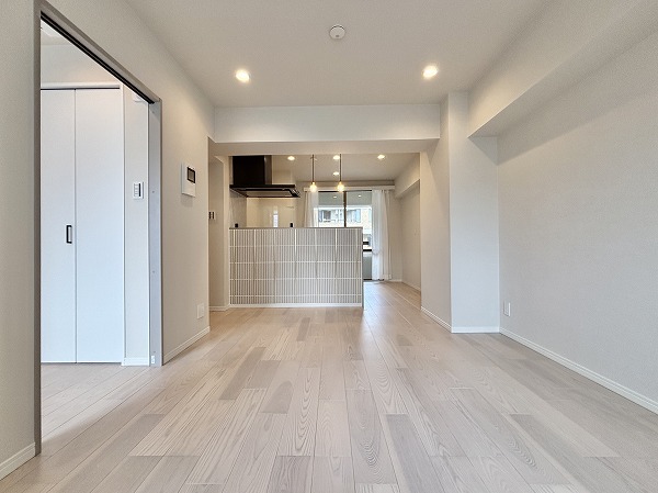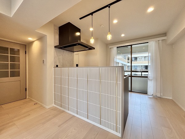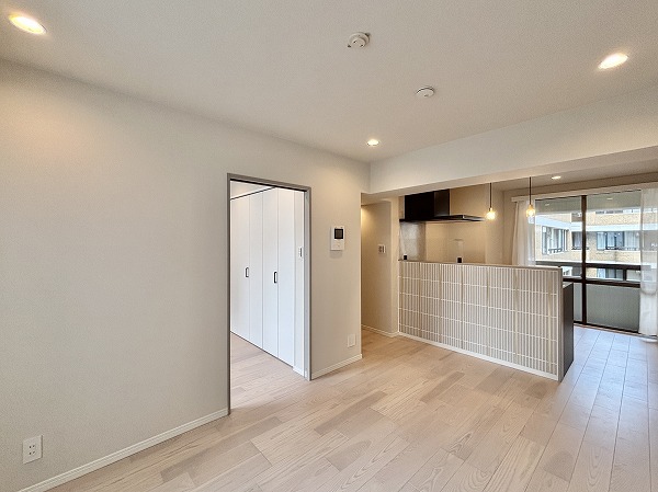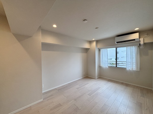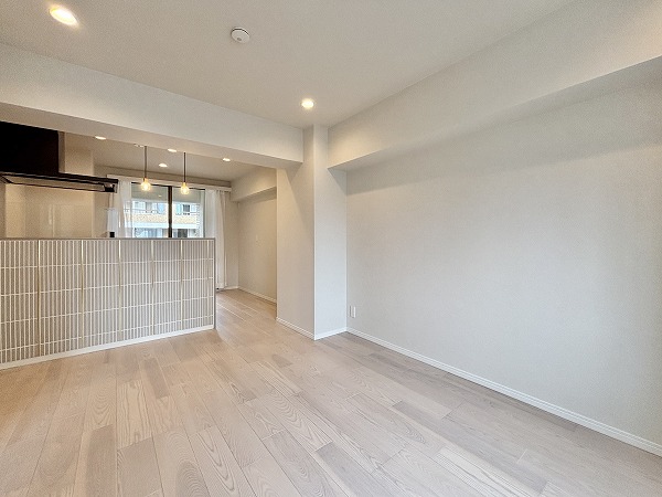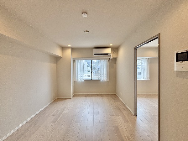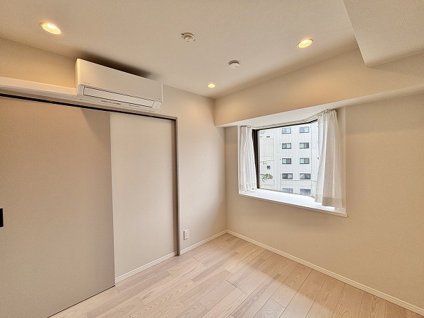 リビングダイニングキッチンは台形のような形になっています。少しコンパクトな間取りなので、家具の配置を工夫する必要がありますね。ハイサッシの大きな窓から陽の光が射し込む明るいお部屋☀ダウンライトや間接照明が多用され、お部屋をより広く、明るく感じさせてくれました。エアコンを完備しており、お引越しの初日から快適にお過ごしいただけますよ。