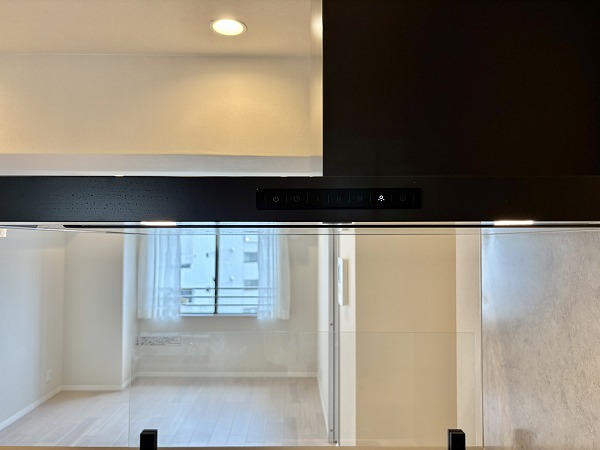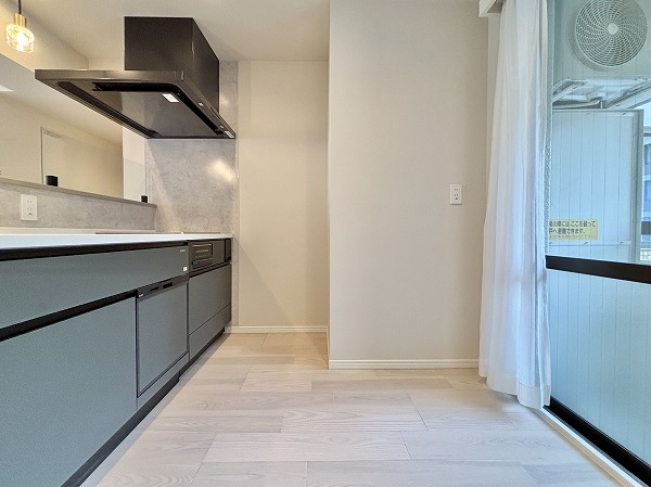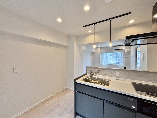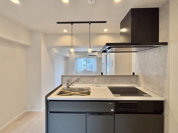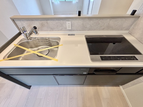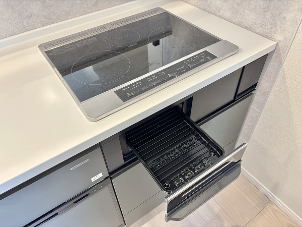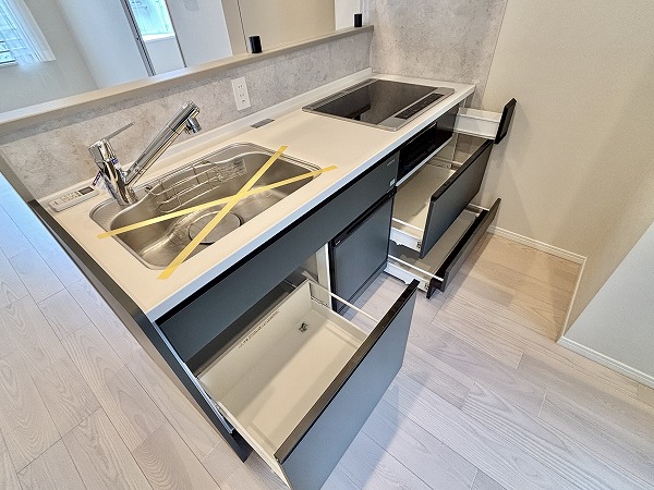 キッチンはモノトーンで統一され、空間のアクセントとしてスタイリッシュな印象を与えています。壁面のタイルもデザイン性が高く、さりげなくおしゃれな雰囲気を演出。IHクッキングヒーターを採用しているためガスコンロに比べて安心感が高く、小さなお子さまがいるご家庭でも安全に調理をお楽しみいただけます♩
