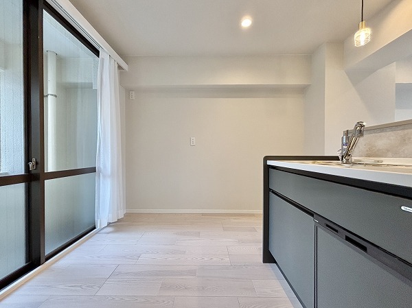 新規交換されたシステムキッチンは見通しの良いフルフラットタイプ🍳ワイドなキッチンシンクならお皿洗いがスムーズに行えそう◎さらに、浄水器一体型の水栓を搭載していますよ。美味しいお水をお料理や飲み水にご利用いただけますね。IHクッキングヒーターはガスコンロと比べて、火災のリスクが少なく安心です。