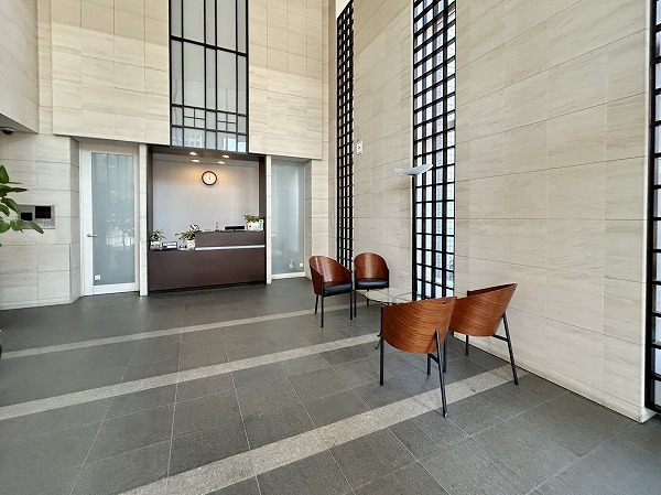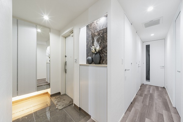 上品な大理石のアクセントと収納カウンターが調和した玄関。メインルームが見えづらい設計でプライバシーを保護。さらに大容量のシューズクローゼットを備えており、ご家族全員分の靴をすっきり整頓できます✧