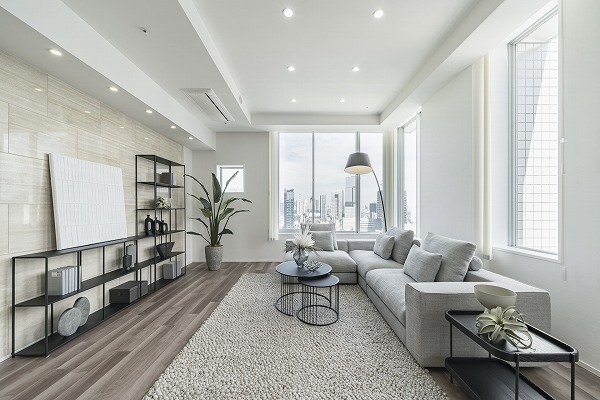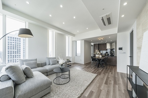 プレミアムフロア最上階の角住戸。約23.3帖の開放的なリビングダイニングは、ハイサッシから街並みを見渡せ、上質な素材感と丁寧なデザインが日々の生活に高級感と安心感をプラス。ホテルライクな空間でゆったりと寛げます♡