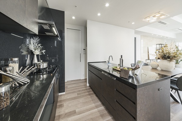 約4.1帖のブラックをアクセントにした対面キッチンは、ゆとりある広さで開放感抜群。家族やゲストと会話をしながら調理できる設計で、窓の外の景色も楽しめます☀収納豊富なカップボードが備わり、見た目と機能を兼ね備えたキッチンスペースです。
