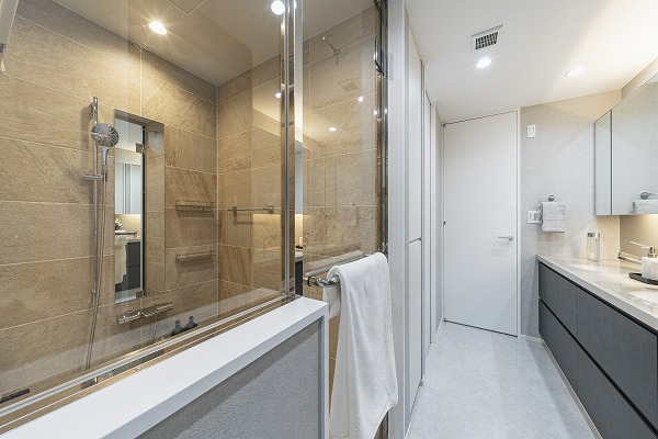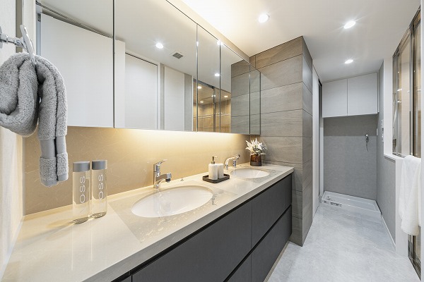 落ち着いたモノトーンのサニタリールームは、シンプルでありながら上質なデザイン。ダブルボウルの洗面台で朝の忙しい時間も2人並んで快適に使用できるのが嬉しいポイント。整理整頓もしやすく、日々の身支度がストレスフリーに。