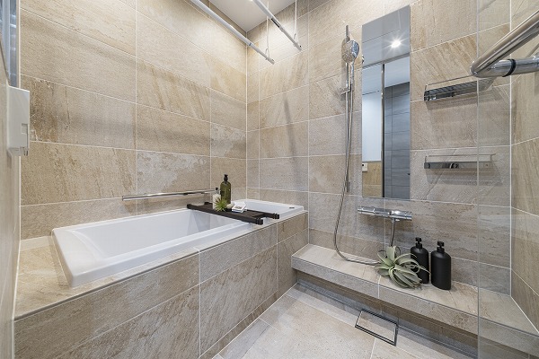 タイル張りで高級感あふれるバスルーム。ガラス張りで閉鎖的に感じられない爽やかな造りです。手すり付きで安全面に配慮され、追い炊き・浴室乾燥機も完備。デザイン性と機能性を兼ね備えた快適空間です◎
