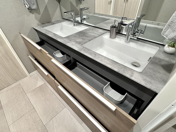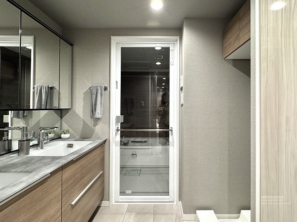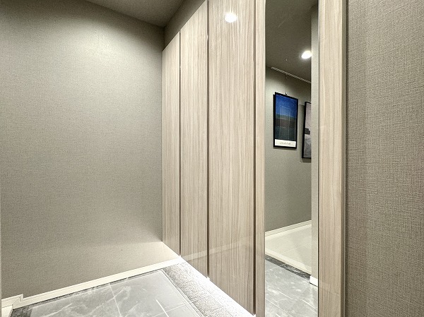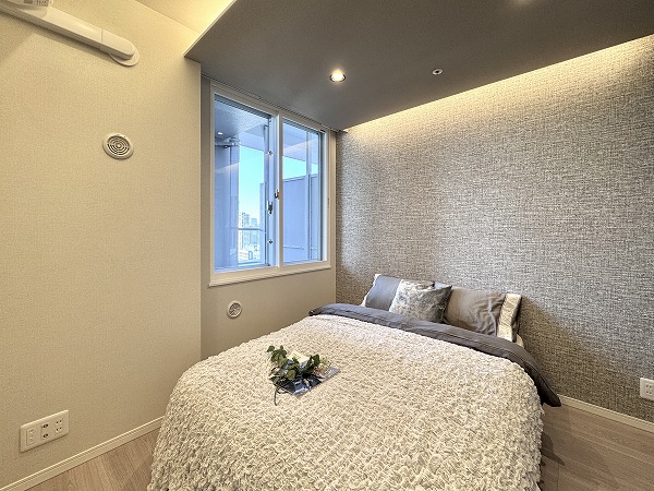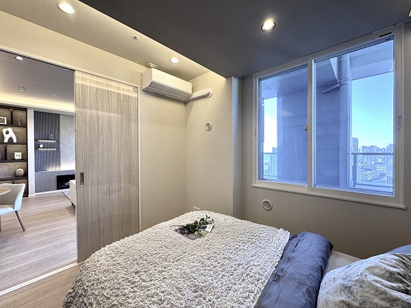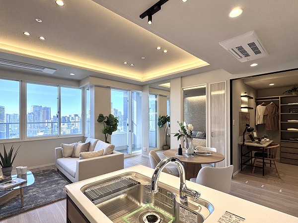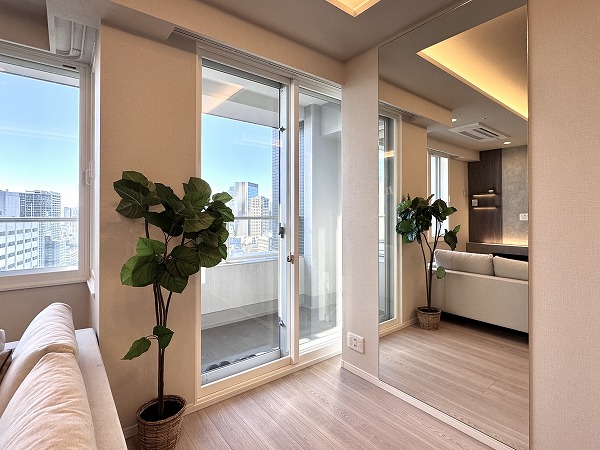 今回ご紹介したのは27階に位置する2LDK。専有面積は約62㎡とゆとりのある居住空間が確保されています。特に約18.1帖のLDKはそもそものびのびとしたスペースでありながら、バルコニー側に豊富に取り入れられた窓や、間接照明、大きな全身鏡が取り入れられているおかげで、空間に奥行きを感じられ開放感があふれる清々しい空間です。また、高層階の特権であるダイナミックな眺望も魅力的なポイント。窓の外には大都会港区の街並みを一望することができますよ。