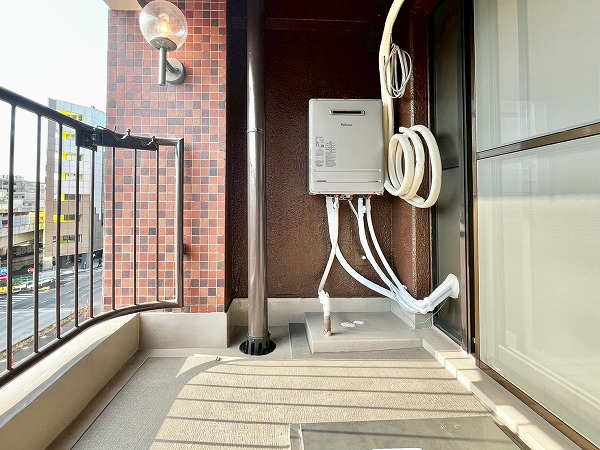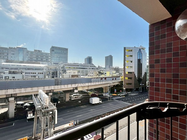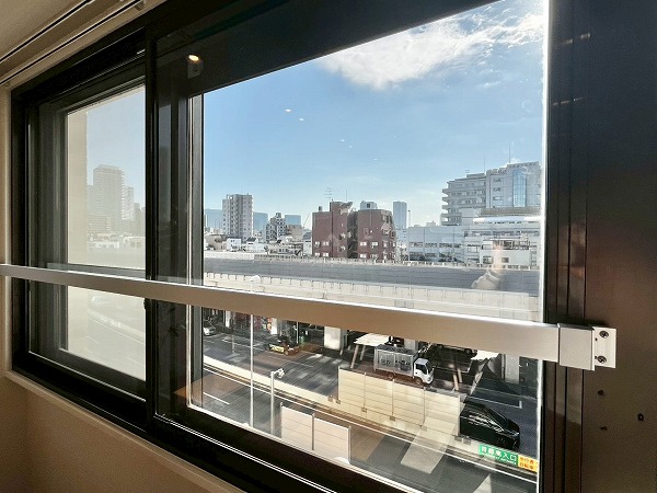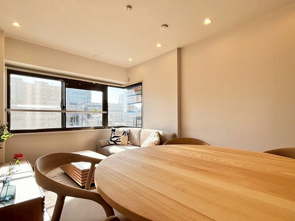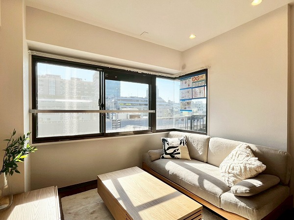 メインルームの角には南西方向に向かって窓が設けられています。窓の右面はバルコニーになっているのでプライベート感抜群。目の前は遮るものがない道路で、眺望は良好です。ソファに座って外の景色を眺めれば、ちょっとしたくつろぎの時間が持てそうですね。