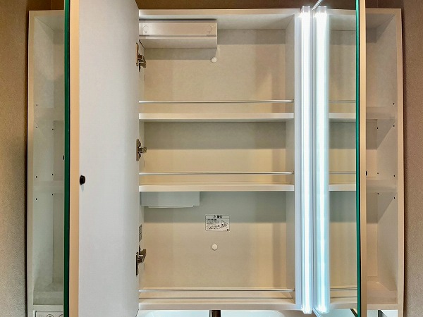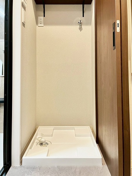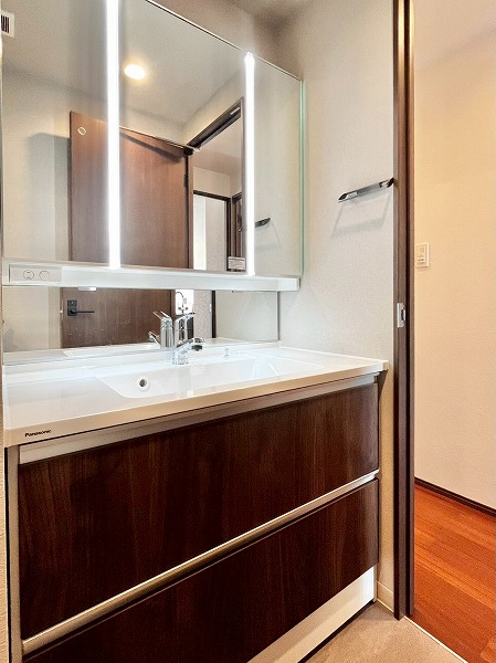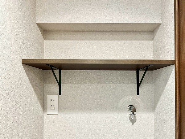水回りがコンパクトにまとまり、使いやすいパウダールーム。洗面台の鏡についたライトは、身支度の際にお顔を明るく照らしてくれますね。動線を邪魔しない位置に洗濯機置き場が設けられ、上部には洗剤なども置いておけるシェルフがついています。