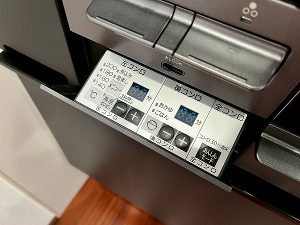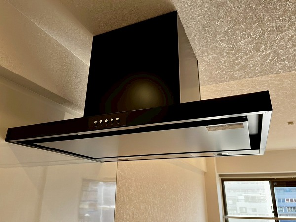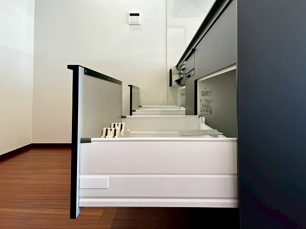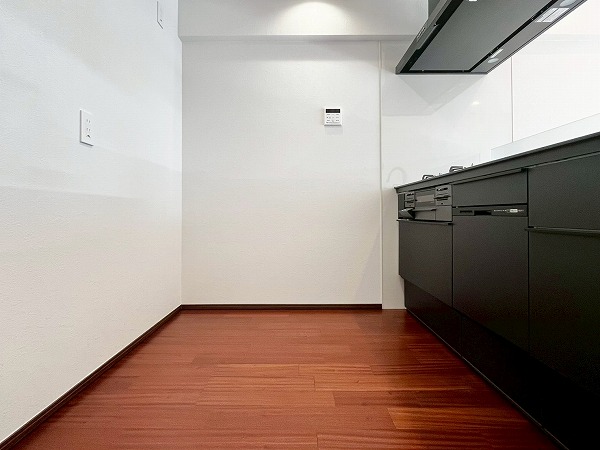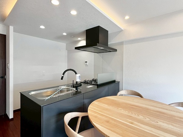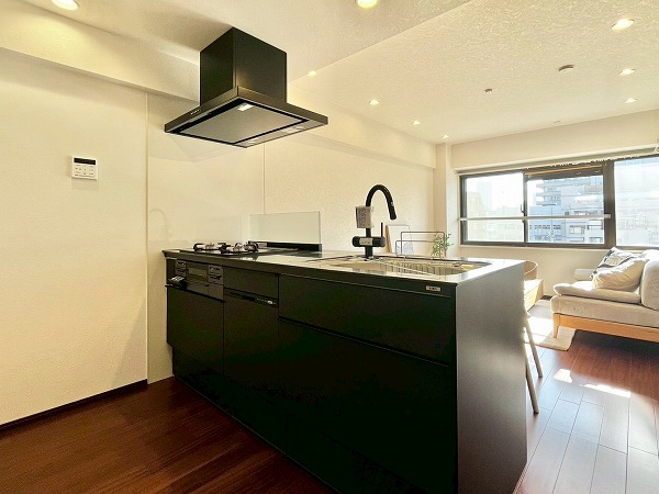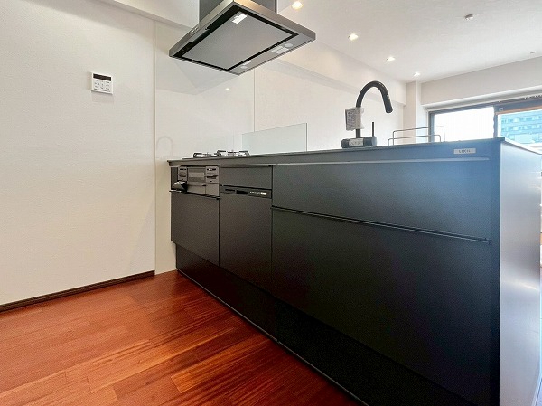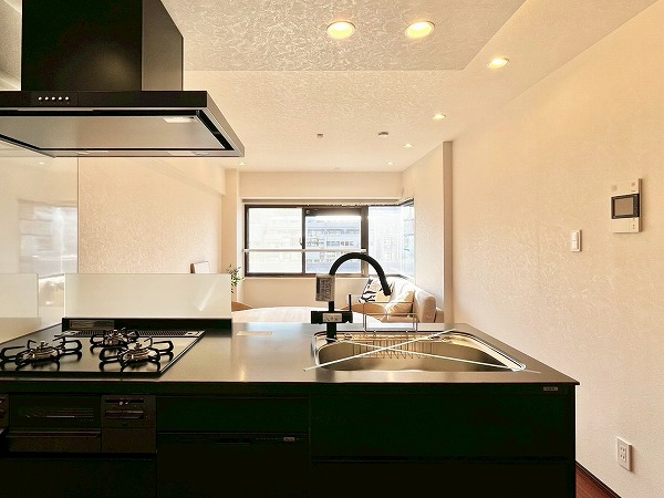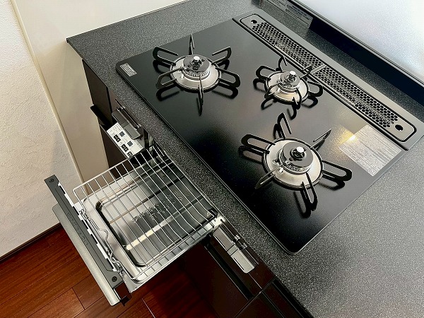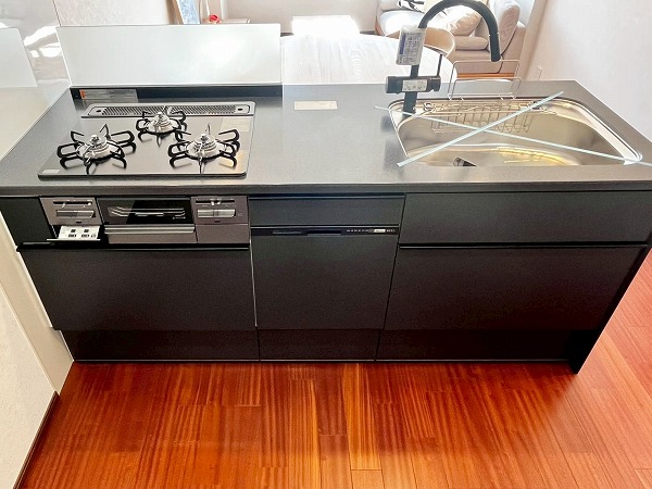 3口コンロ・食洗機を搭載したオープンキッチン。側面と水栓のブラックの色合いが、お部屋全体の印象をクールに引き締めています。コンロには温度やモードを変更できる機能が付いており、お料理好きの方におすすめです。