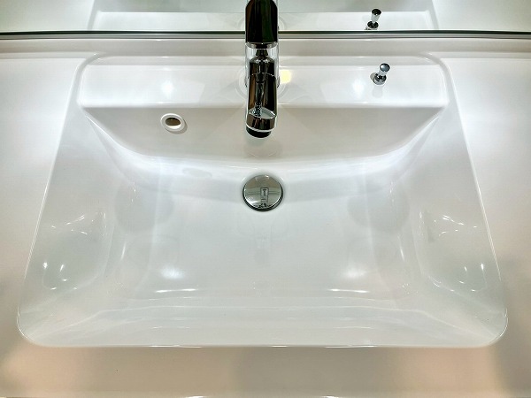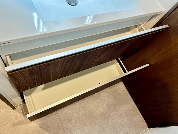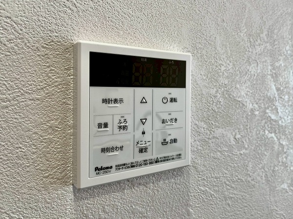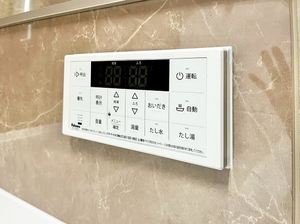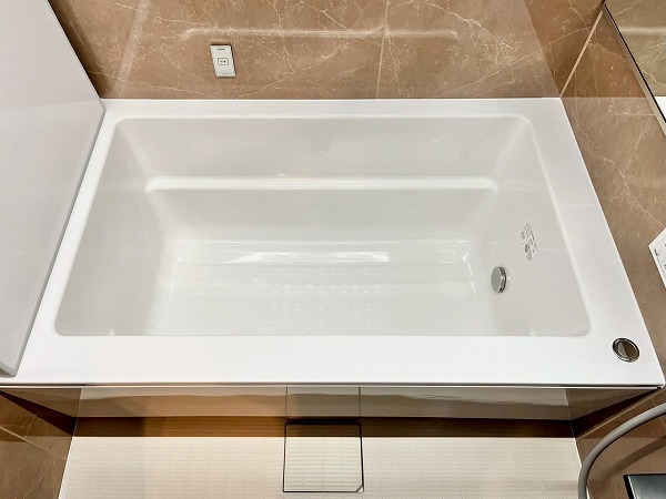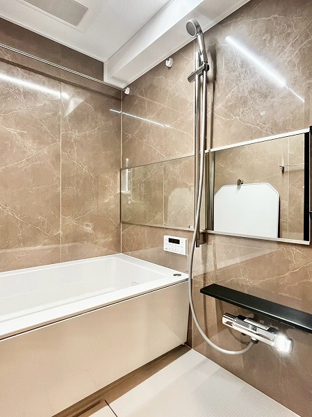 バスルームには石調のパネルを採用し、光沢がリラックススペースにふさわしい雰囲気を醸し出しています。横に長い鏡のおかげで、空間が広く感じられました。ゆったりとしたバスタブは追い焚き機能付き。ご自身のタイミングでおくつろぎいただけます。