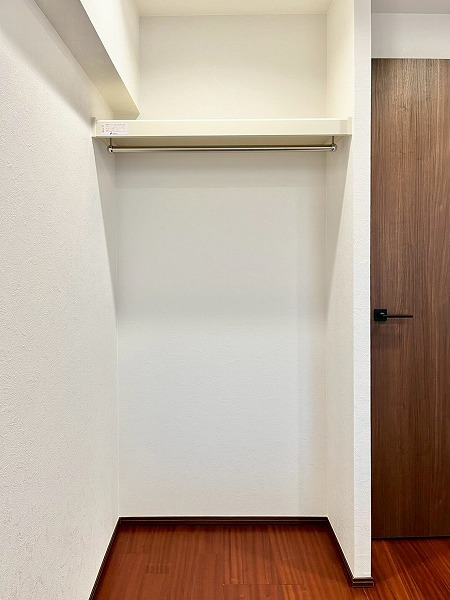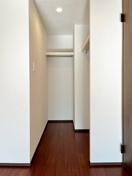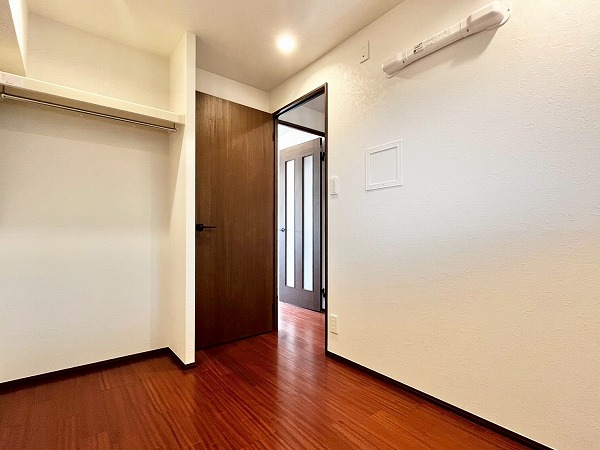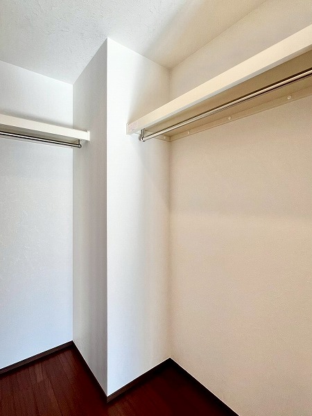 主寝室としてお使いいただける約6.3帖のお部屋。お部屋の角に設けられたウォークインクローゼットにはハンガーポールが設けられており、毎日着るお洋服を綺麗に掛けておけます。もう1つの洋室にもオープンクローゼットがついており、使う人の目線が考えられた造りです。