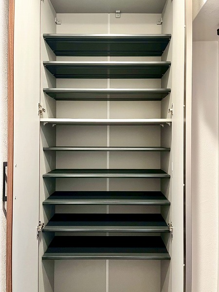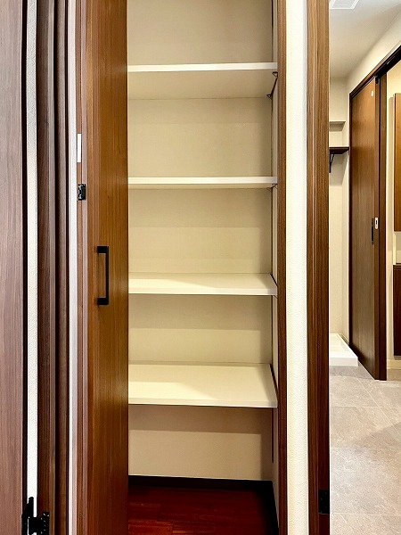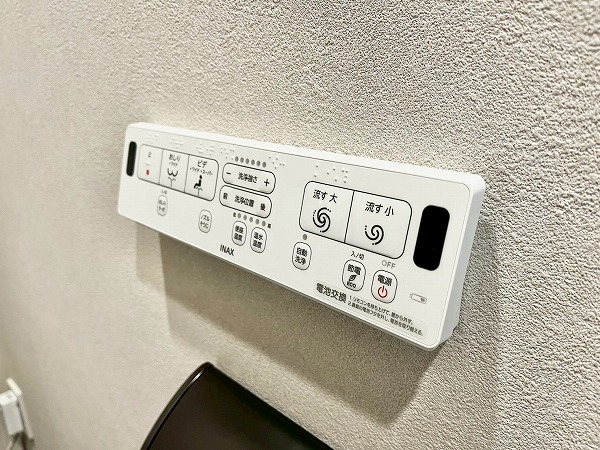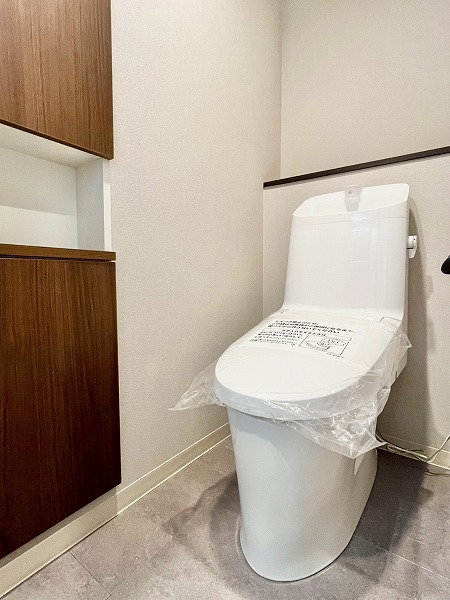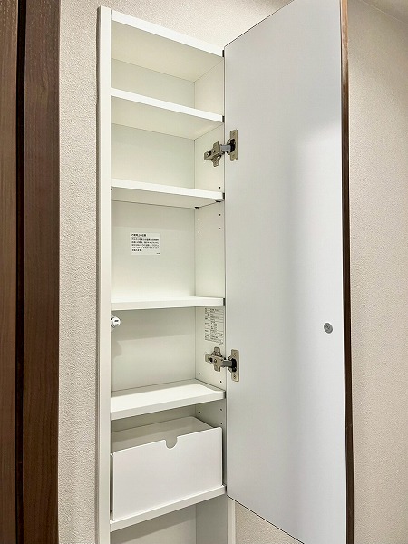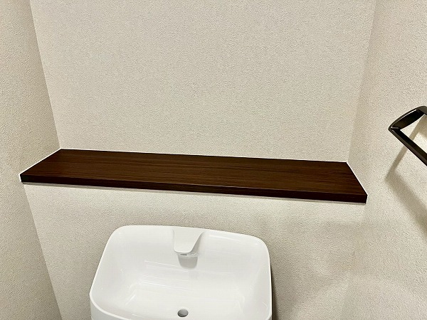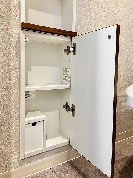 木目とホワイトの壁が落ち着いた印象のウォシュレットトイレは、収納が豊富。背面のニッチ棚に加え、入り口から見て左側にも縦に並んだ壁面収納が。トイレットペーパーやお掃除用具をすべてここにしまえば、出し入れする際も楽々です。