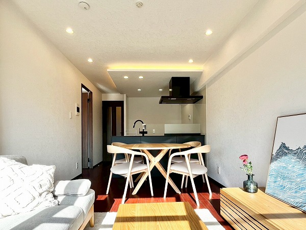 リビングダイニングキッチンは約11.2帖。下がり天井によって、キッチンスペースと生活のスペースとが上手に分けられています。オフホワイトの壁にダークブラウンの床は、どんな色合いの家具でもオールマイティに置いていただけそうです◎