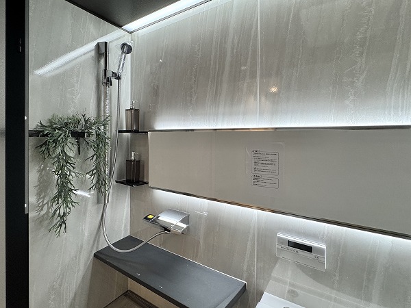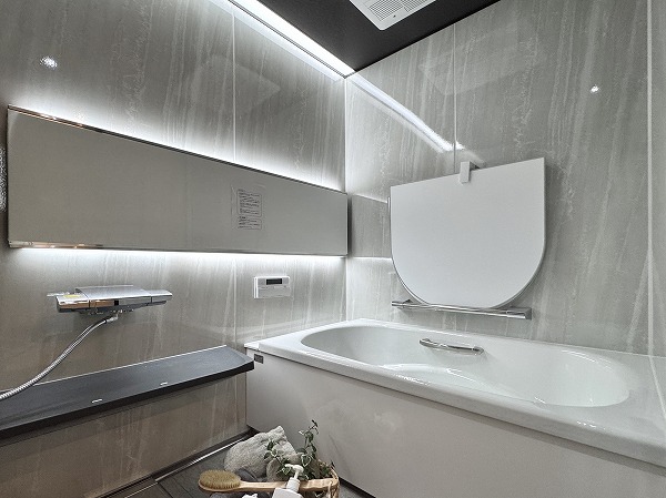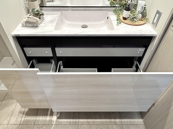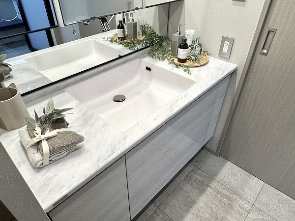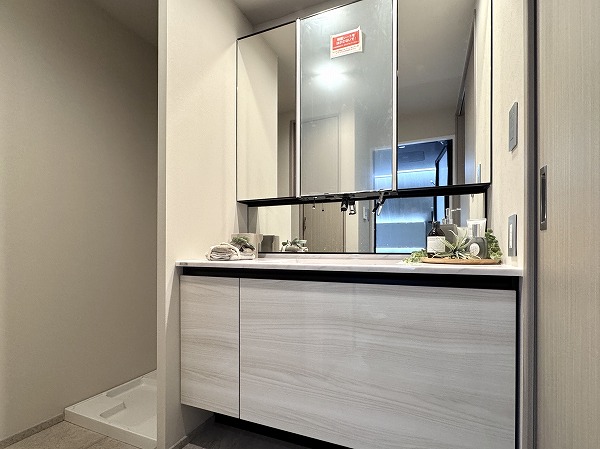 サニタリールームは水回りを集約し、移動距離を抑えた効率的な動線設計。大型の洗面化粧台には3面ミラーを採用し、身支度もスムーズです。収納力も高く清潔感のある空間を保ちやすいのも嬉しいですよね。