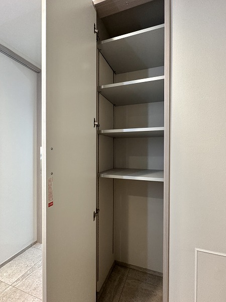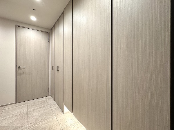 玄関には収納力抜群のシューズクローゼットを設置。靴好きの方でも安心の容量で、傘や小物類もまとめて収納可能です。フットライトが足元を照らしてくれるのも、さりげなく嬉しいポイント。