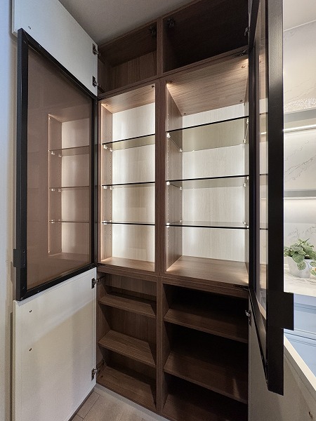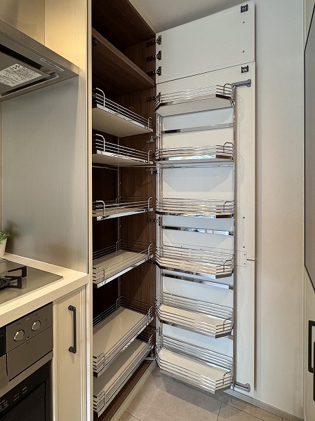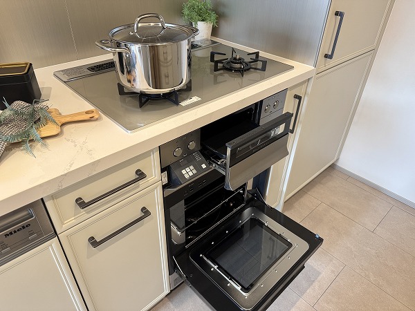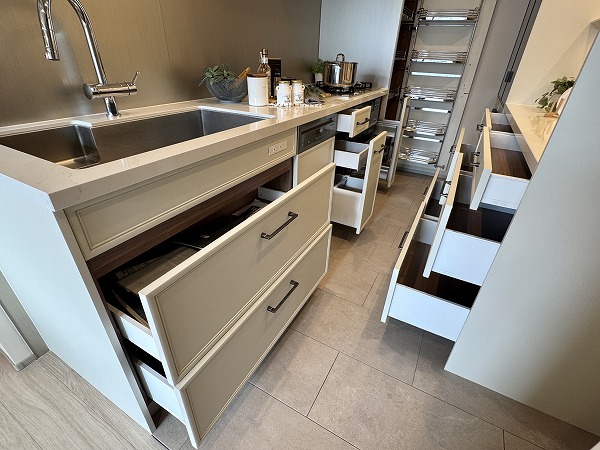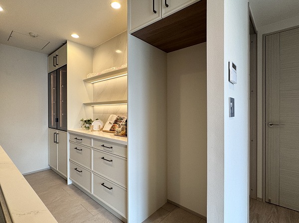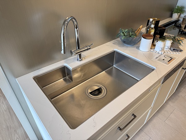 キッチンは約4.0帖と広さがあり、複数人での作業もスムーズ。食洗機付きなので後片付けもラクにこなせます。背面収納には食器やインスタント食品などをたっぷりしまえ、キッチン周りをすっきり保てそう◎