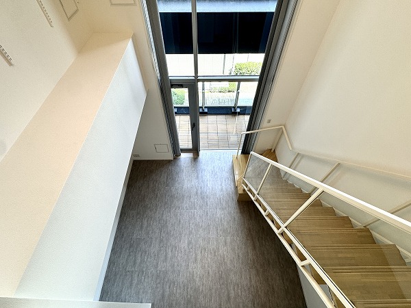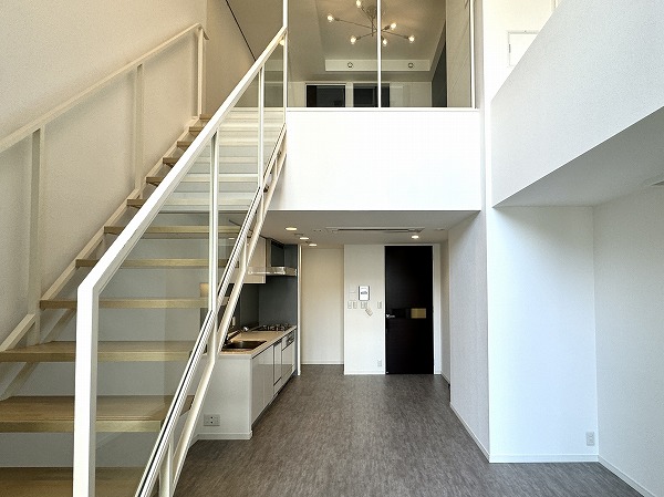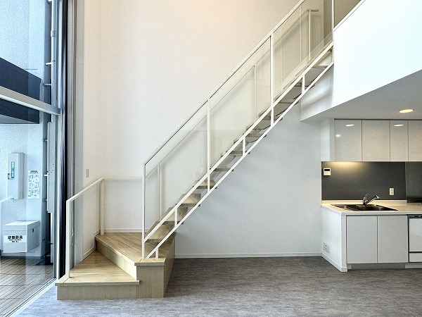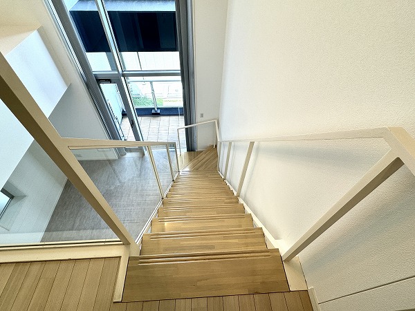 ご紹介するのは、4階と5階に広がるメゾネットタイプのお部屋。スケルトン階段には透明のガラス柵が設置され、光と視線が通り抜ける開放感溢れるデザインに。階段そのものがインテリアのアクセントとなり、上下階を繋ぐ動線さえも美しく演出する、メゾネットならではの贅沢空間です。