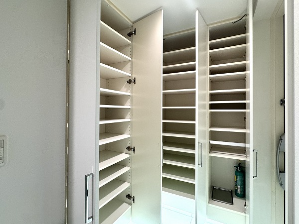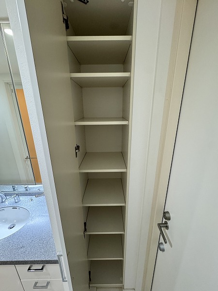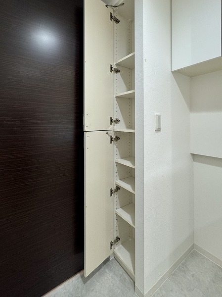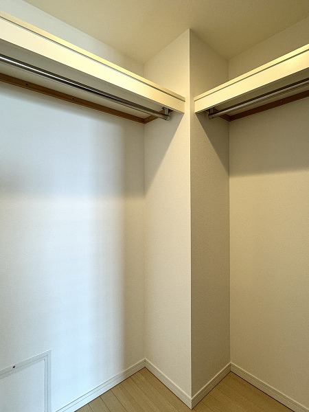 洋室には、広々としたウォークインクローゼットを完備。奥行きが十分に確保されているため、スーツケースや季節物の衣類、スポーツ用品や大型バッグなども余裕で収納可能です。棚やハンガーパイプを活用すれば衣類や小物を整理整頓しやすく、日々の身支度もスムーズに。
