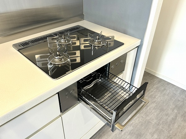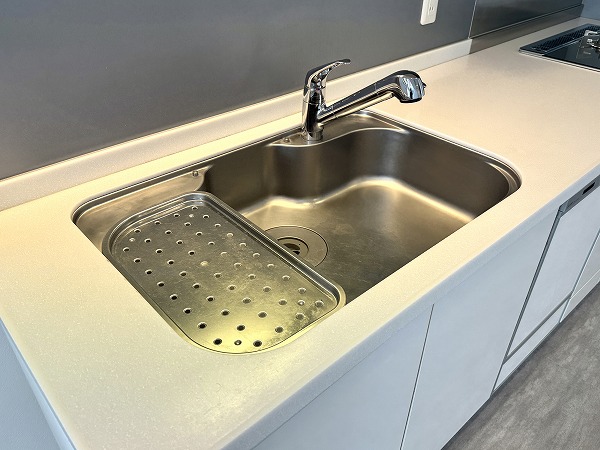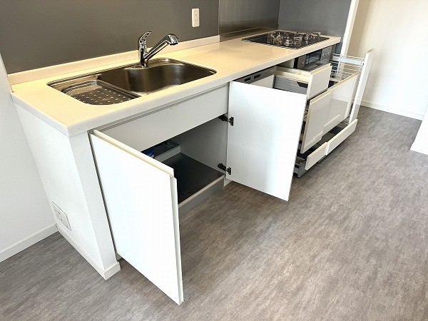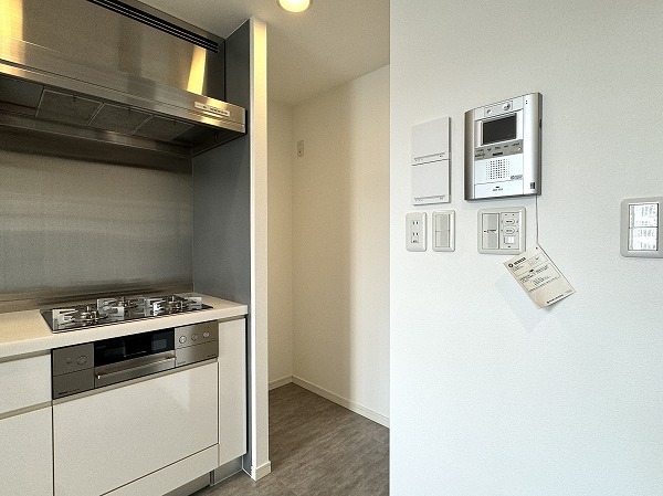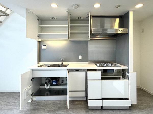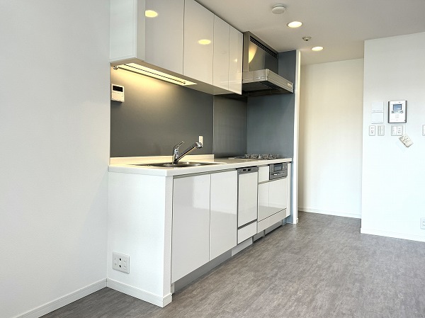 キッチンは、リビングダイニングの広さを最大限に活かせる壁付けレイアウト。設備は現状のままですが、程よく使い込まれた雰囲気があり、神経質でなければそのままでも十分に活用可能です。食器や調理器具をまとめて収納できる棚やカウンターを置けば、使い勝手もさらにアップするのでは♩
