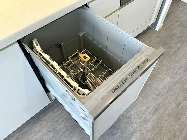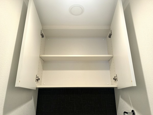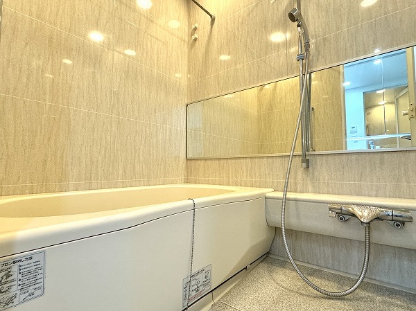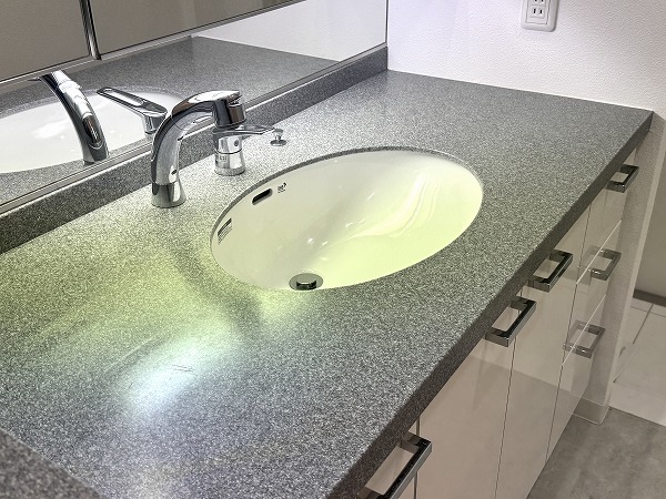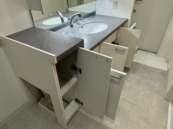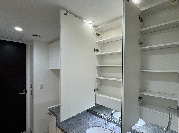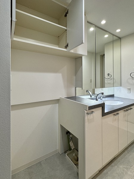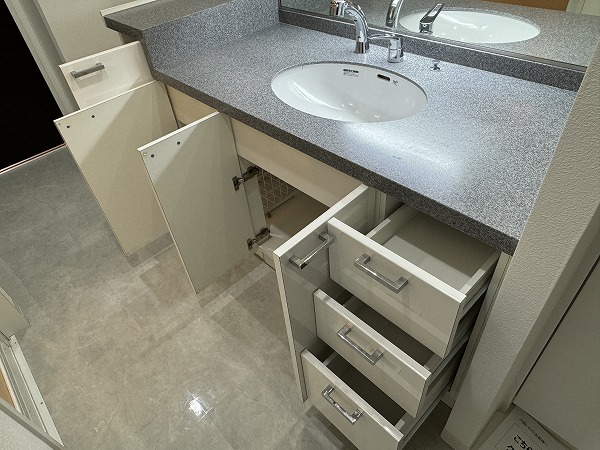 サニタリールームはゆったりとした設計で、洗面化粧台の左側に洗濯機を設置できるようになっています。扉付きの収納も豊富で、バス用品や洗面用品をすっきり片付けられ、毎日の身支度や家事も効率的に♥整理整頓がしやすく、生活感を抑えた美しい仕上がりになっているのも嬉しいポイントです。