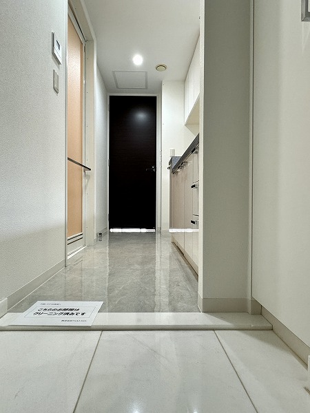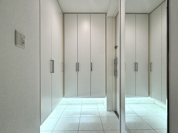 ホワイトを基調とした玄関は、清潔感と上品さを兼ね備えた印象。L字型に配置された大容量のシューズクローゼットはフロートタイプで、下部の間接照明が夜間でも足元を優しく照らし、優しく迎えてくれますよ✧