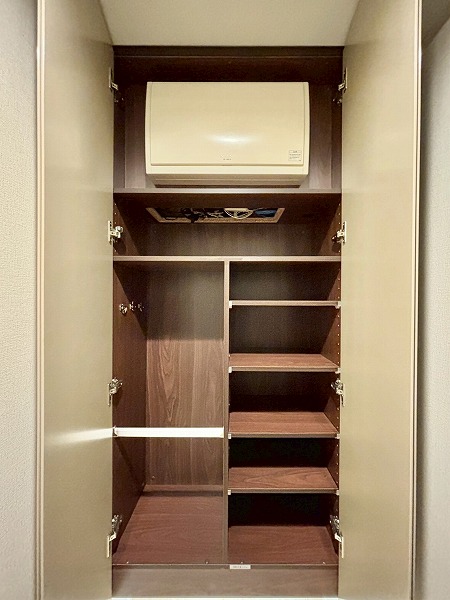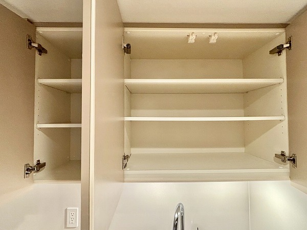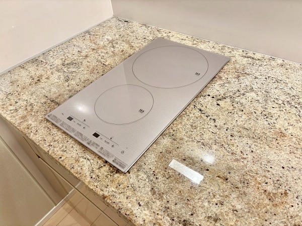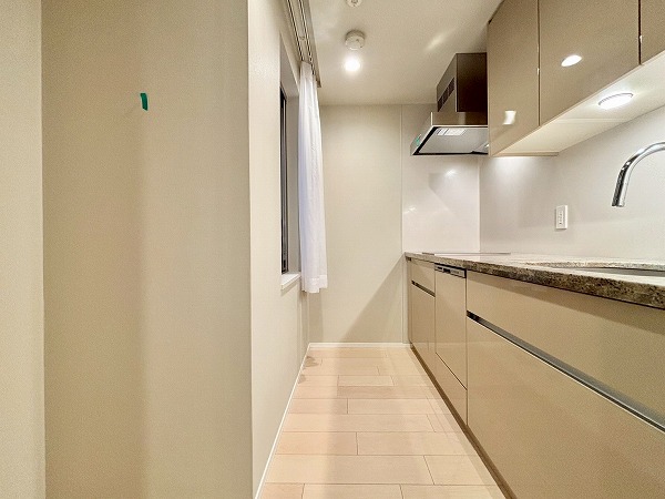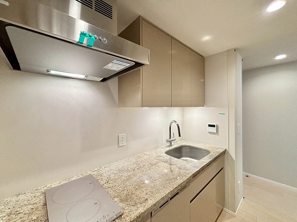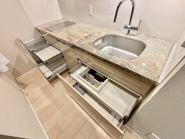 キッチンはサニタリールーム同様カウンターに大理石調の素材が使用され、統一感がもたらされています。ワークトップが広く、使い勝手が良さそう◎IHクッキングヒーターはガスコンロよりも火災のリスクが低く、女性の一人暮らしでも安心です。食洗機やディスポーザーなども完備。