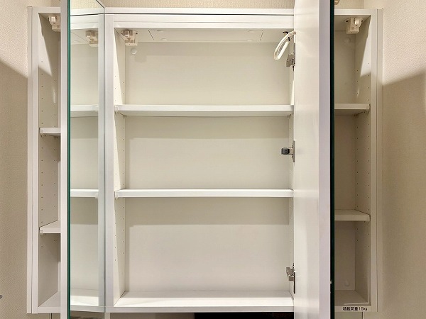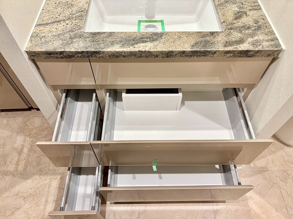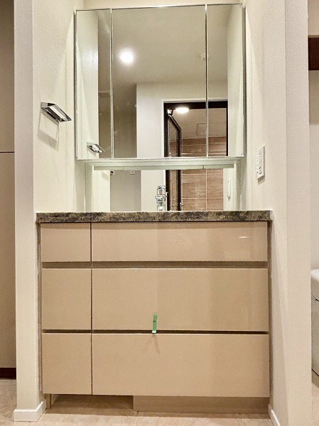 大きなミラーの洗面化粧台は、鏡の角度を変えられると人気な3面鏡タイプ。カウンター部分には大理石調の素材が使用されていて、とっても高級感があります✨ソープディスペンサーやタオルなどのデザインにもこだわりたくなるデザイン。