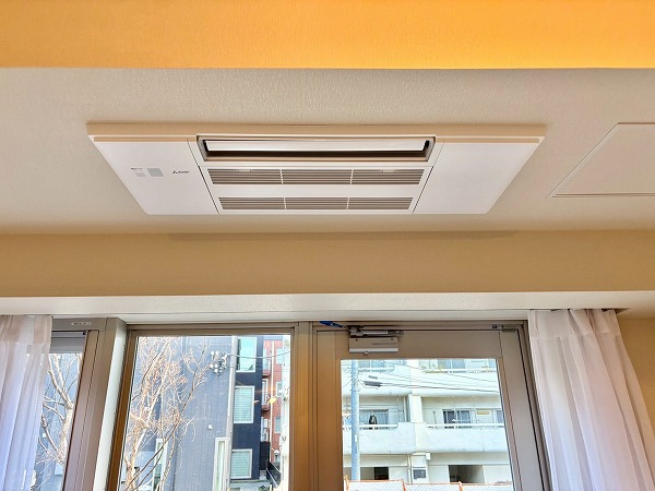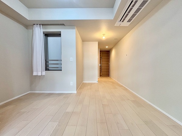 リビングダイニングキッチン約11.7帖。窓は吹き抜けに面した小窓だけですが、洋室との間にある引き戸を開ければ明るい光がお部屋いっぱいに射し込みます。エアコンと床暖房を完備しており、オールシーズン快適に暮らせますよ。