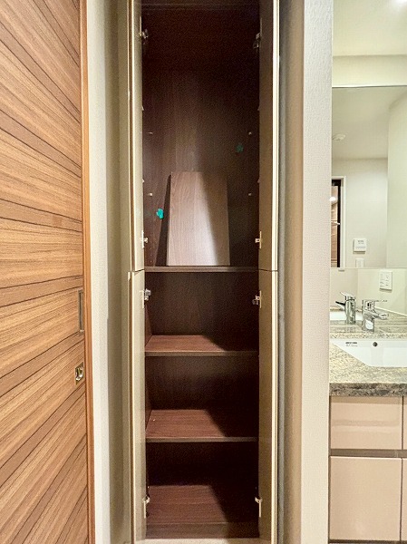 玄関右手に位置するサニタリールームには、洗面化粧台と洗濯機置き場、トイレ、リネン庫、バスルームがまとまっています。トイレには仕切りがないので、来客時や2人以上でお住まいになる場合には譲り合ってご利用くださいね。