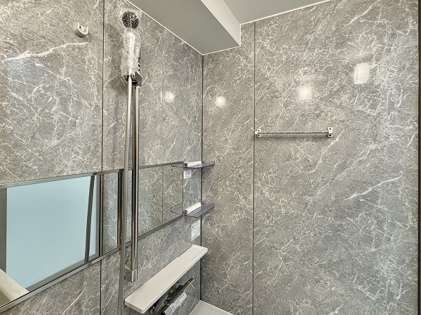 グレーの石目調パネルがアクセントになったバスルームは、落ち着いた雰囲気。ワイドミラーの効果で実際以上に広く感じられ、1日の疲れをゆっくり癒せそうです。追い焚き機能も備わっており、帰宅時間が遅くなっても快適なバスタイムを楽しめますよ♡