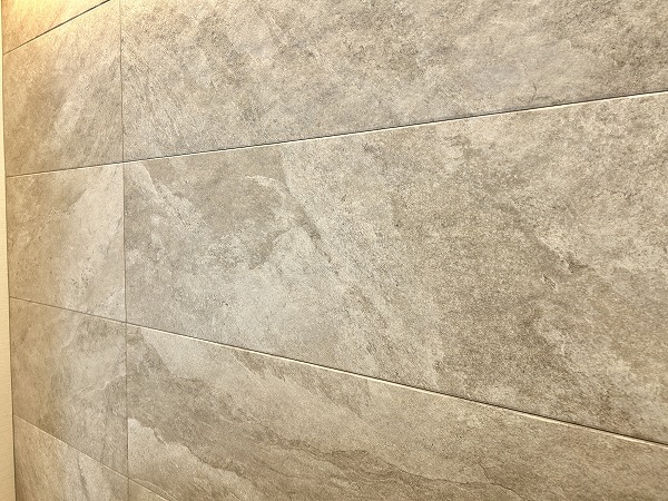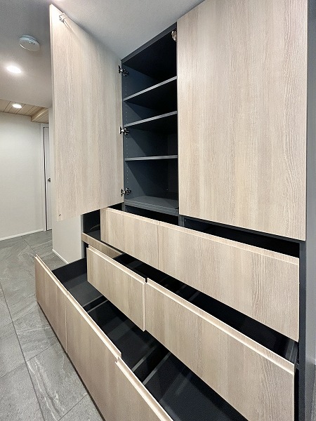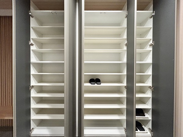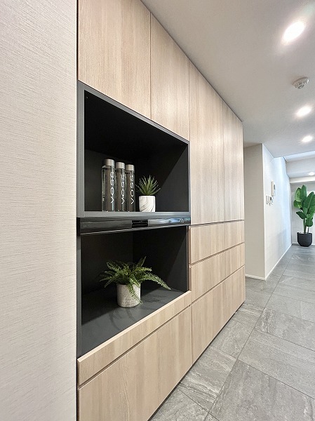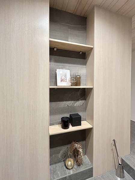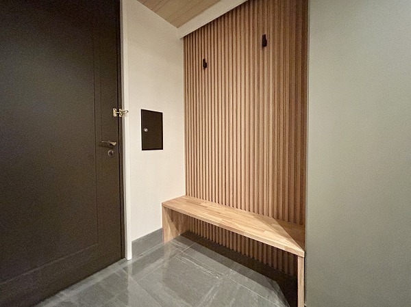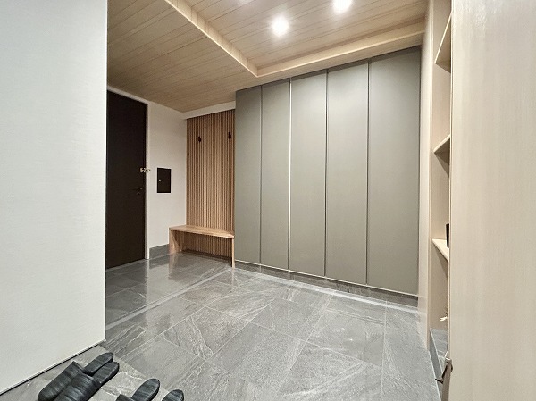 ゆったりとした玄関は石調タイルとウッドパネルでシックな印象。ベンチが設置されているので腰かけて靴を履くことも可能です。上部フックには帽子やドライフラワーを飾れるほか、可動棚とシューズボックスで靴を整頓できます。