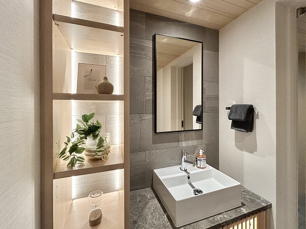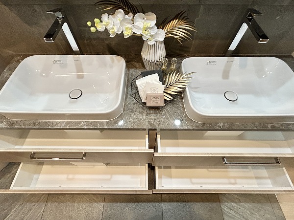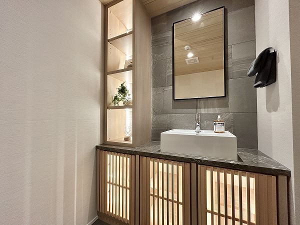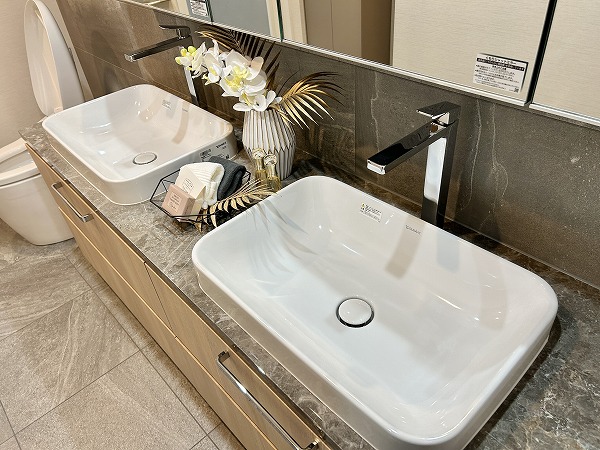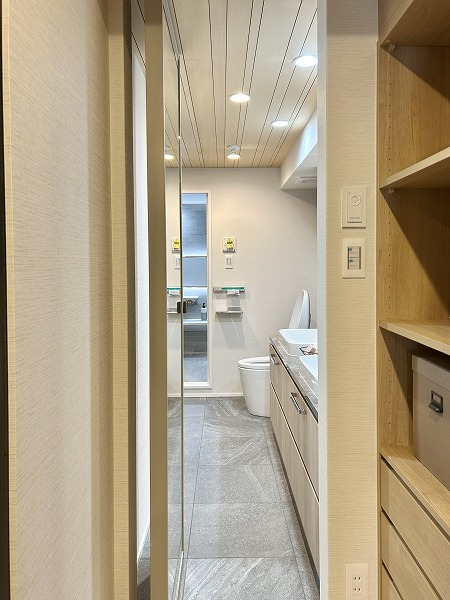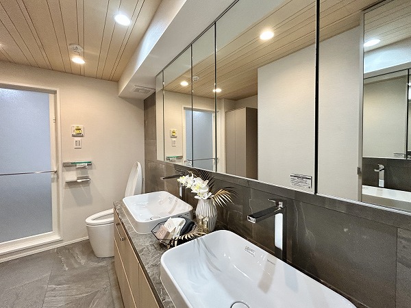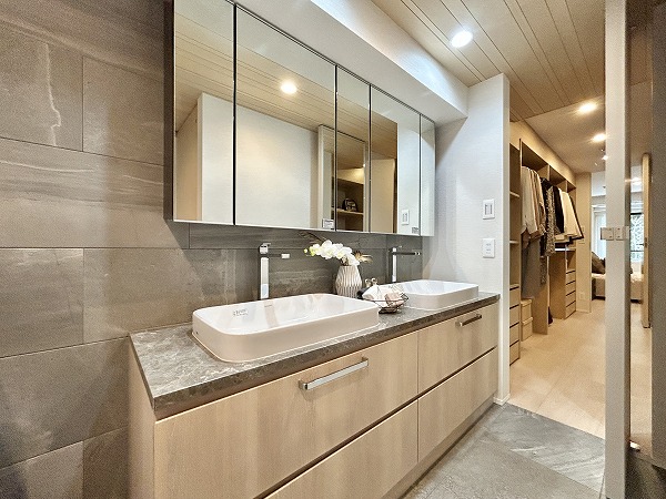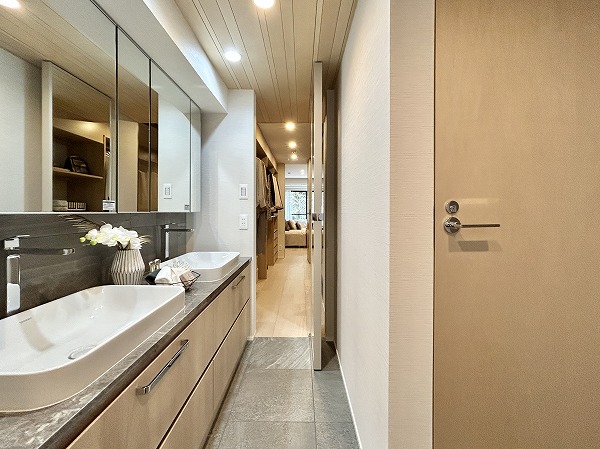 ウォークインクローゼットはサニタリールームにもつながるウォークスルー設計。2ボウルタイプの洗面化粧台で家族並んで身支度可能。トイレはサニタリー内と玄関近くに1つずつあり、来客時も便利に使い分けられますよ◎