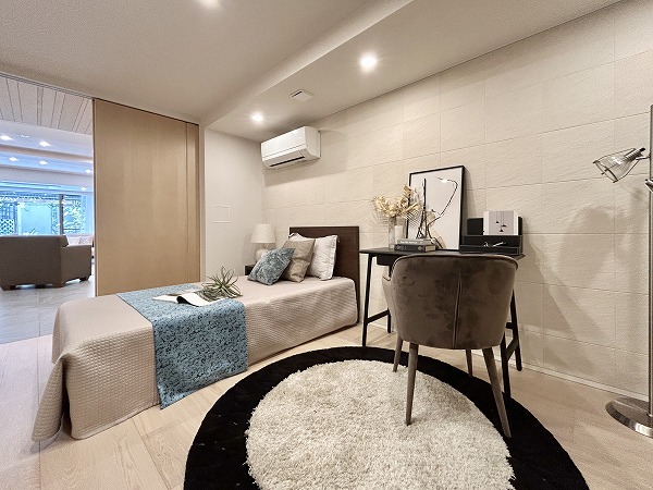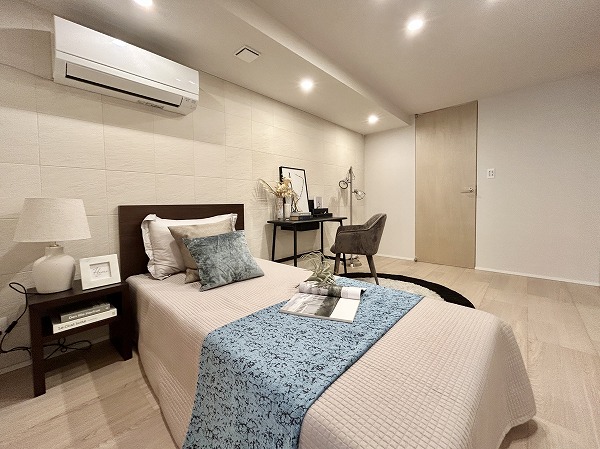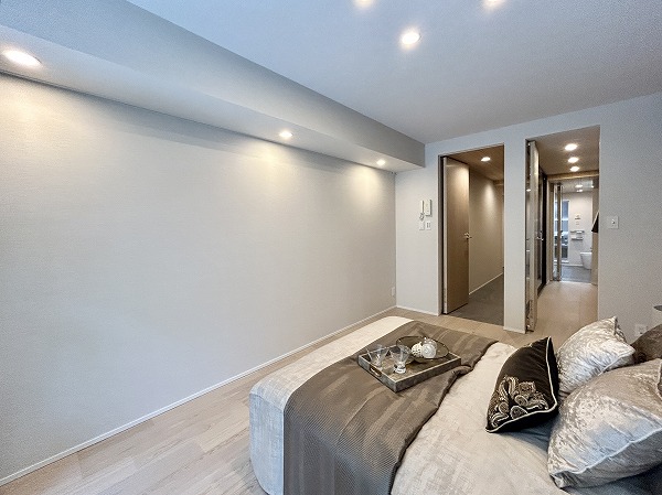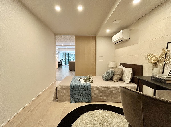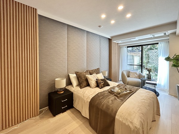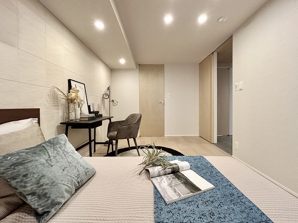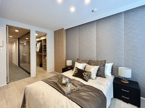 広さ十分な約10.2帖と8.0帖の洋室。大きなベッドを置いてもゆとりがあり、ドレッサーやデスクも設置可能です。10.2帖の洋室は立体的な壁面デザインが上品で、ウッドパネルが温もりを添えていました。ご夫婦の主寝室にぴったりですね。