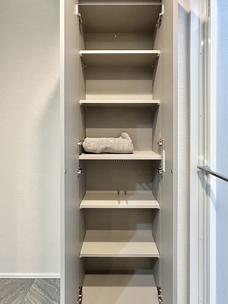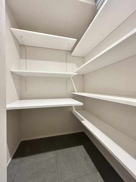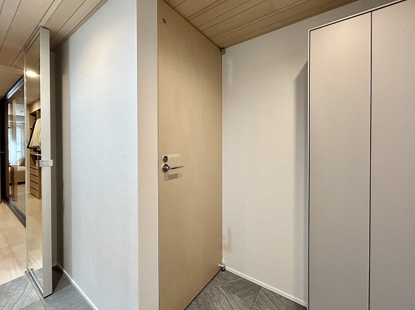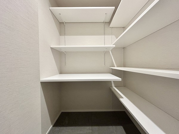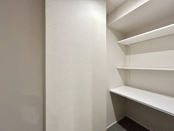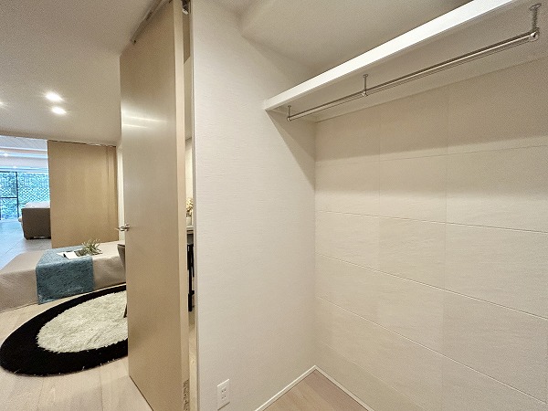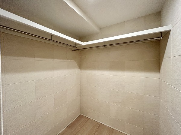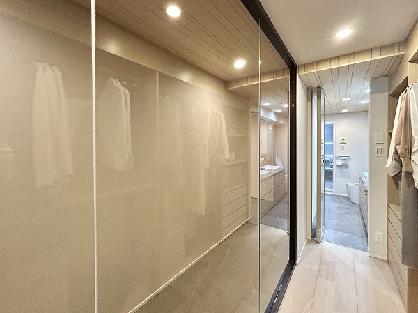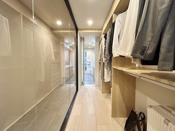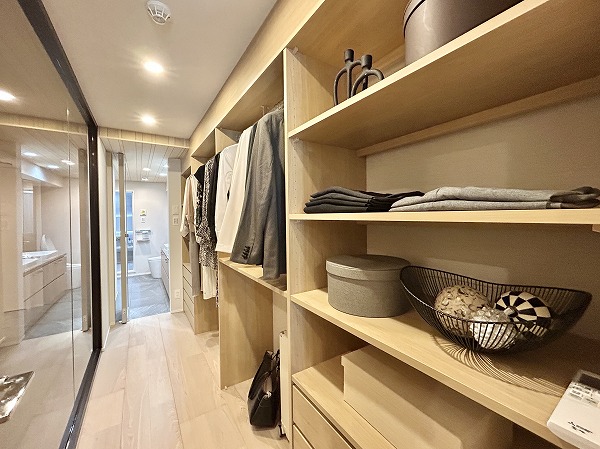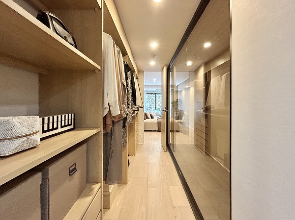 洋室から続くウォークインクローゼットはガラス扉で開放感たっぷり。システム収納でアイテムごとに整理でき、コーディネートを考えながら収納することも可能。もう一方の洋室にも大きなクローゼットが設置されており収納力抜群です。