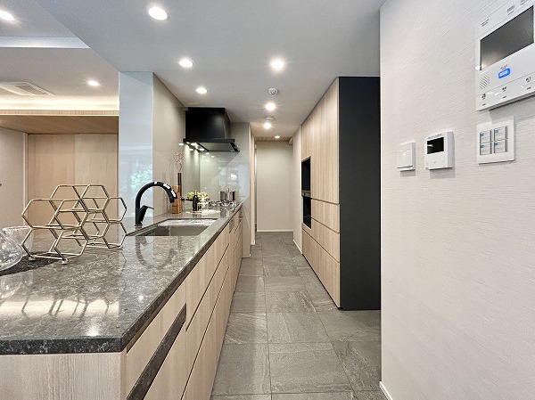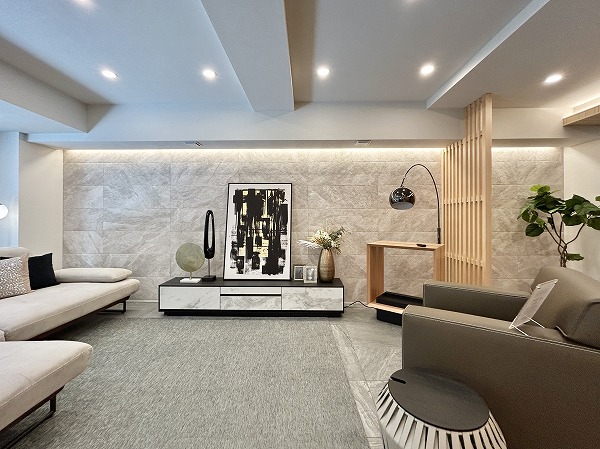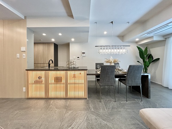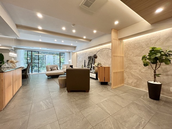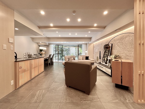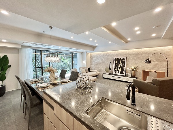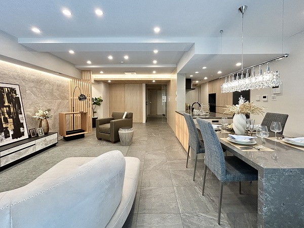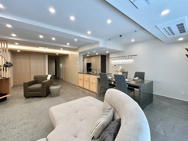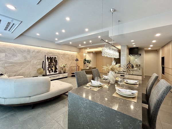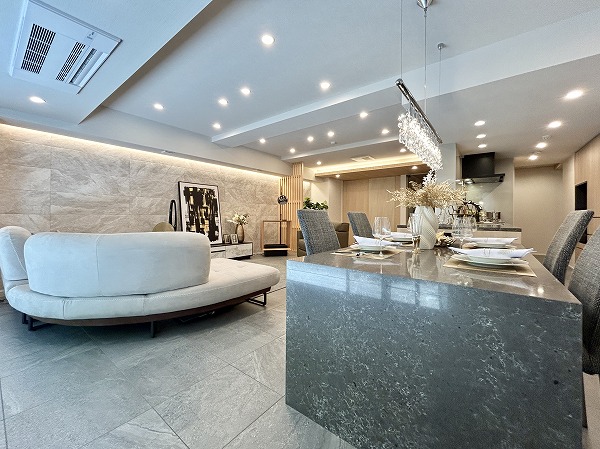 広さ138.62㎡の贅沢な2LDK。リビングダイニングキッチンは約30帖と、まるでホテルのラウンジのようなゆとり。床には涼やかなタイルが敷かれ、夏でも心地よく過ごせます。床暖房とエアコンで、快適さも完璧です◎