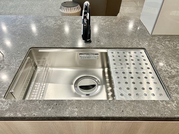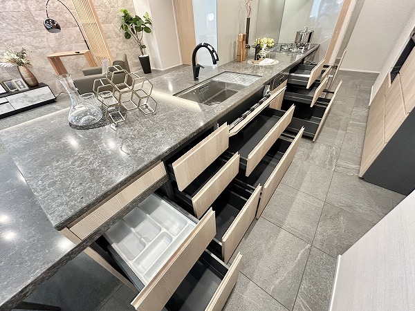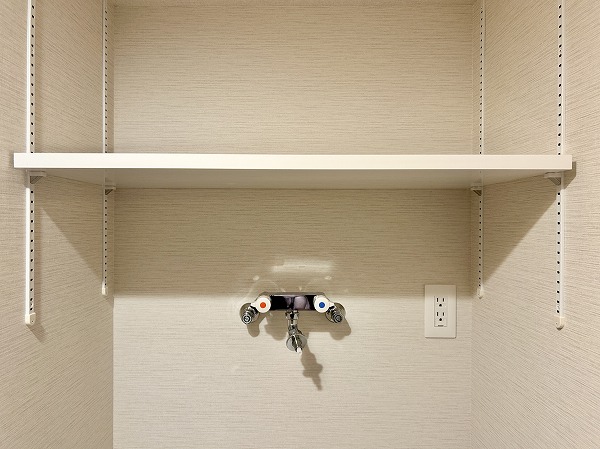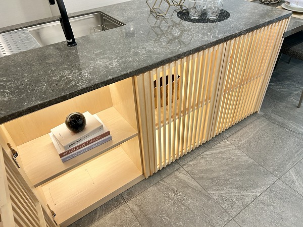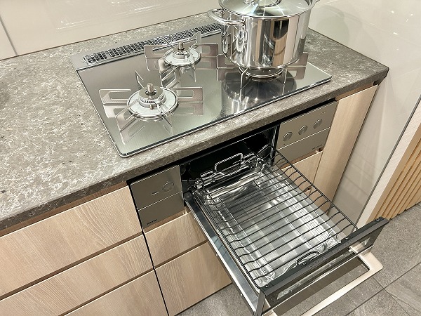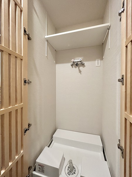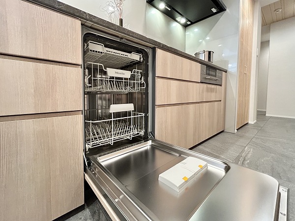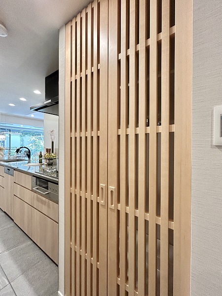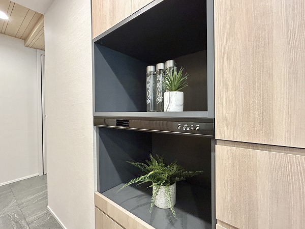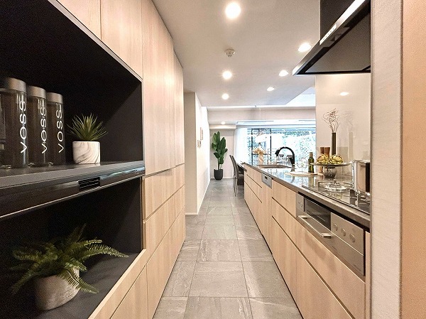 新しく交換されたシステムキッチンは幅広く、家族で並んで料理を楽しめます。フロントオープンタイプの食洗機や3口ガスコンロを完備。台下や前面の収納、さらに背面のカップボードもあり、収納力も抜群♪コンロ横にはお洒落な木製扉の洗濯機置き場も設置されています。