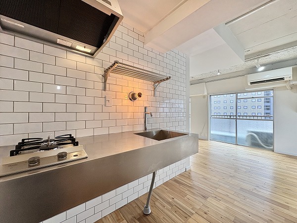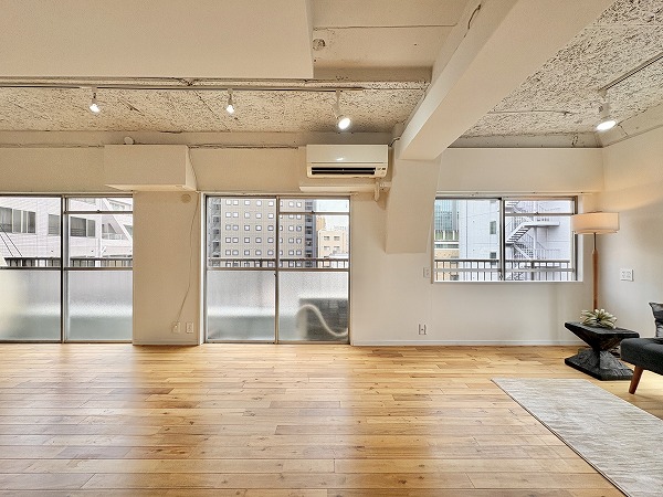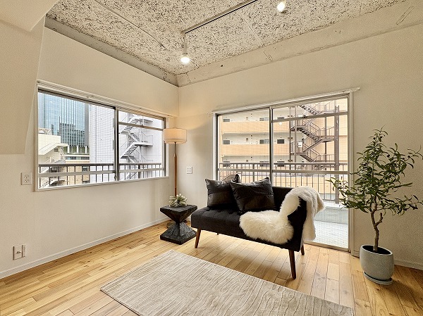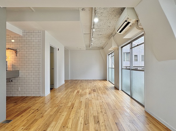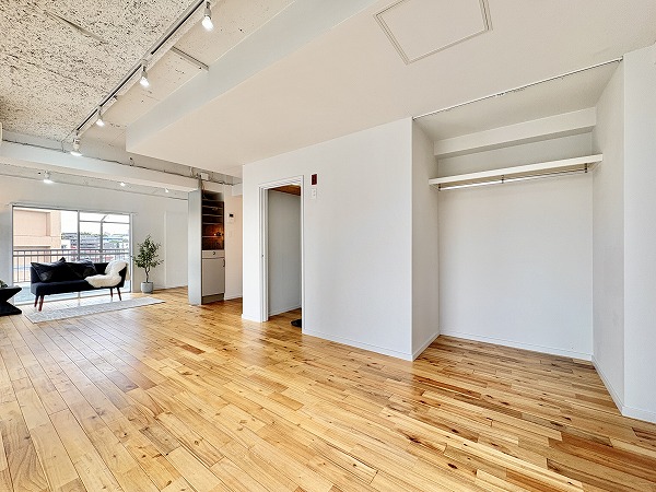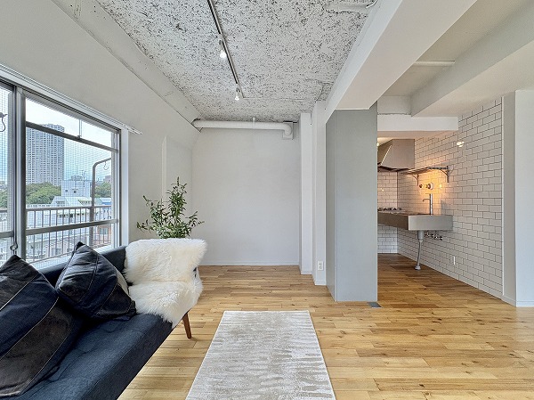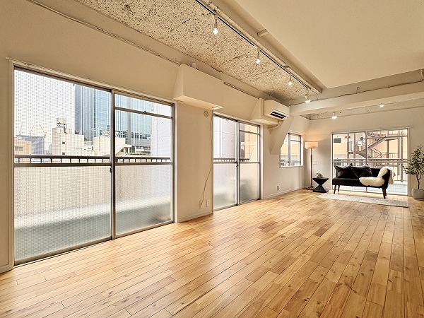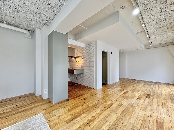 気張りすぎないラフさにキュン♥無垢材フローリング×塗装仕上げの天井がお洒落な大型ワンルームです。ルーフバルコニー付きの南東×南西角部屋なので窓が非常に多く、陽当たり・風通し良好☀現在は約18帖の居室1部屋ですが、売主負担で1LDKに変更することも可能だそうです◎キッチンや洗面といった水回りの設備はかなりシンプルな印象なので、毎日自炊をする方というよりは外食・デリバリーメインの方や、セカンドハウスや事務所として利用するのに適しているのではないでしょうか。シャワールームはユニットバスに変更可能なので、「やっぱりバスタブは欲しい!」という方もぜひご相談ください。ここからは実際に現地で内装を見た感想ですが、インダストリアルテイストや西海岸風など、カッコいい雰囲気のインテリアが合いそうだと思いました。天井のライティングレールから観葉植物を吊るしたりしても良いかもしれません。お天気が良い日はぜひルーフバルコニーへ。たっぷりと光を浴びれば、健康的に気持ちよく毎日を過ごせそうですね。お仕事も捗ること間違いなし!ご質問や内見希望など、お気軽にお問合せください♪ ライター:yuki【25I03】
