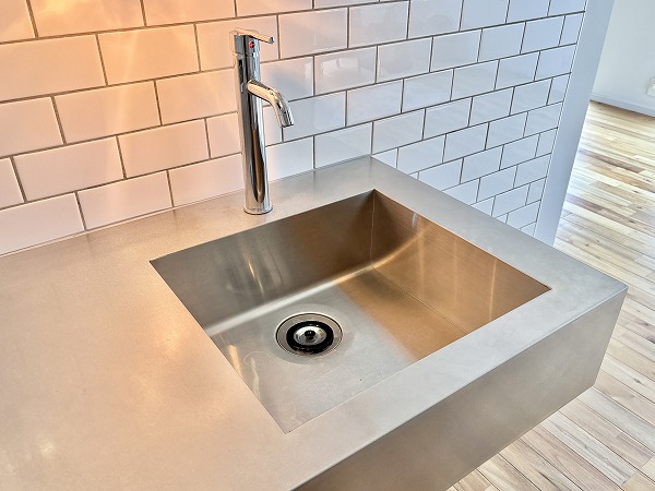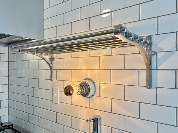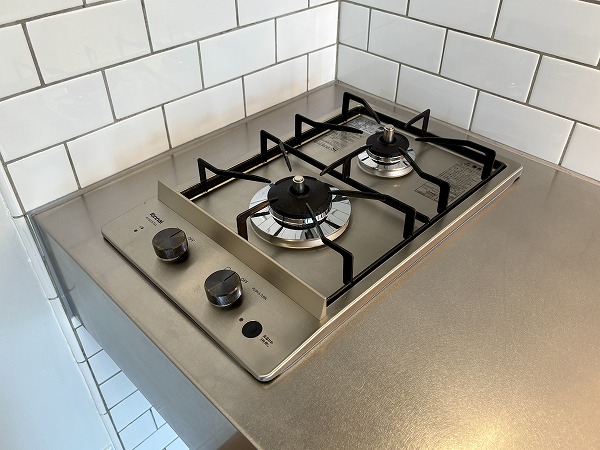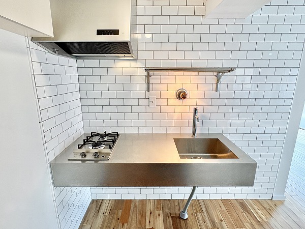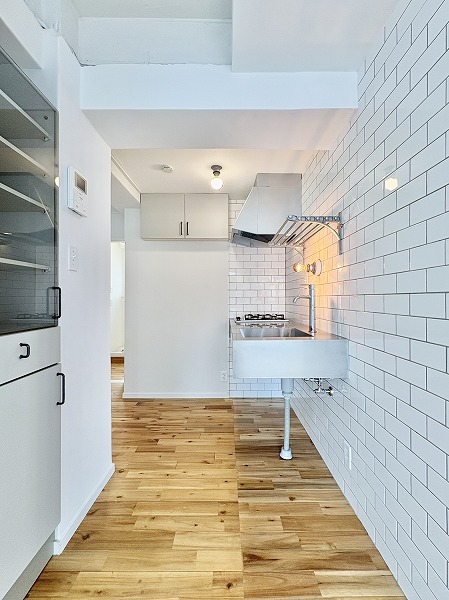 キッチンはホワイトレンガ積みのデザインで、見た目にもこだわった空間。壁面には収納棚があり、食器や調理道具もたっぷり収まります。お料理をするのが楽しくなる、デザイン性と機能性を両立したキッチンです♪