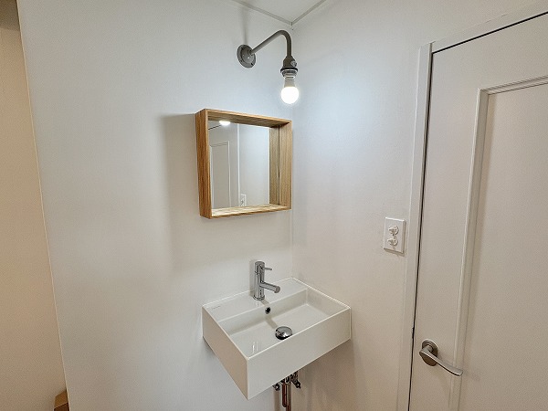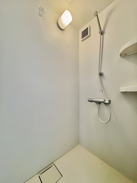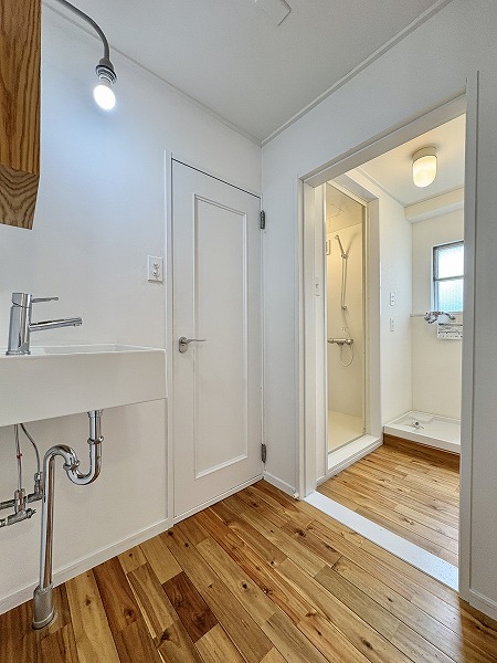 シンプルで清潔感のあるサニタリースペース。コンパクトな洗面台は無駄を省いたデザインでスタイリッシュな印象。浴室はバスタブなしのシャワールーム仕様で、サッと浴びられ掃除も簡単です。