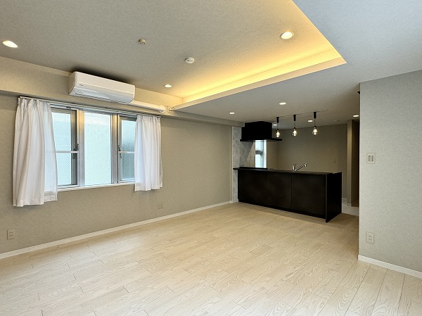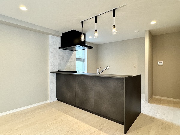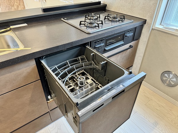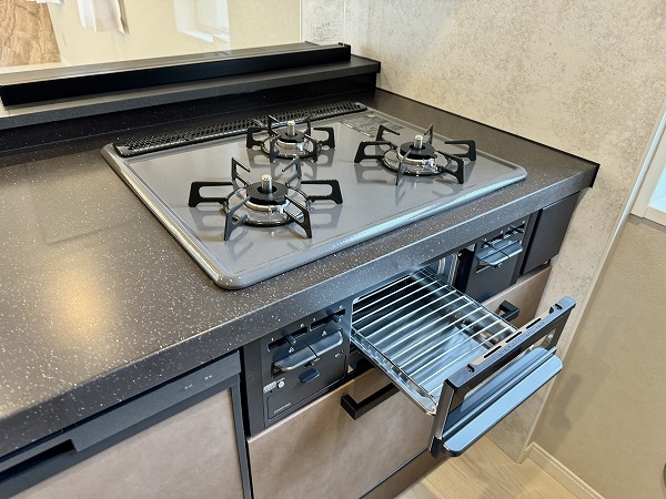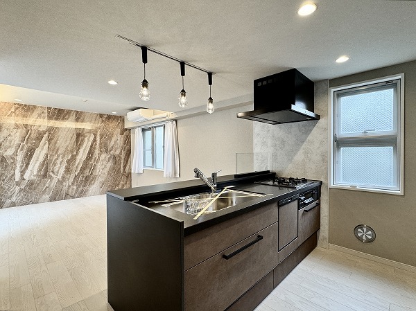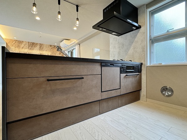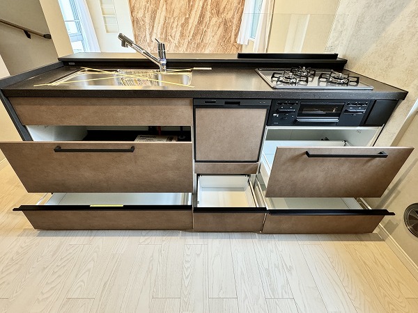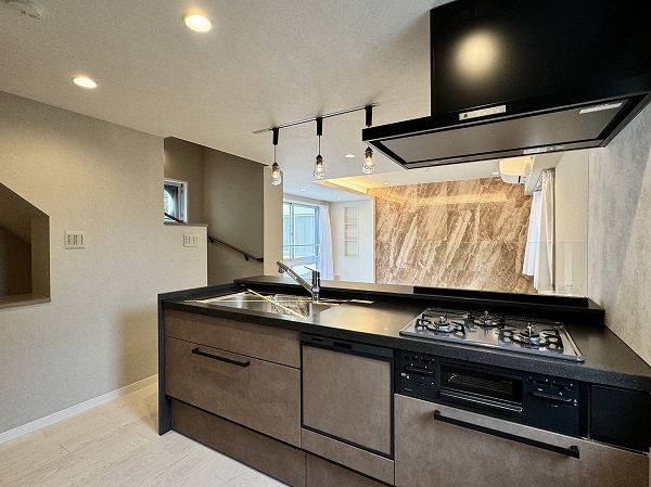 • 上質な素材感と洗練されたデザインが魅力のモダンキッチン。奥行きにゆとりがあり、収納棚を配置しても圧迫感のない開放的な空間が広がります。食洗機・3口コンロ・浄水器・レンジフード付きで、機能面も抜かりありません◎