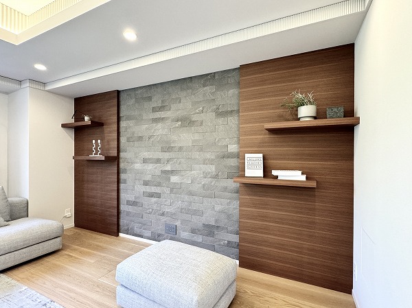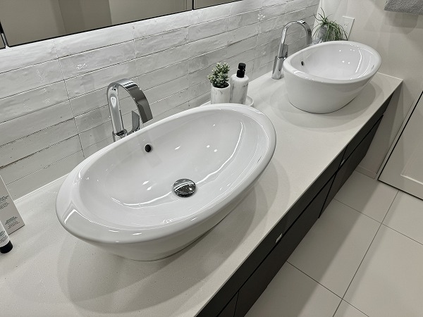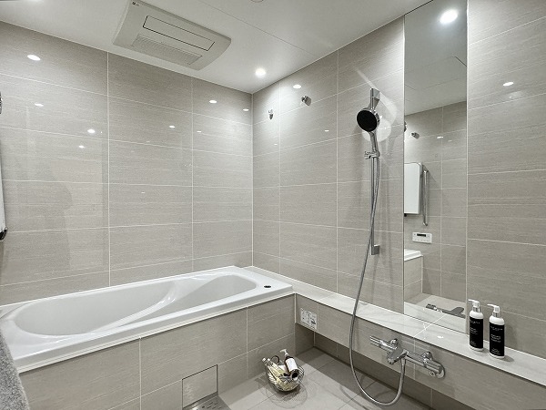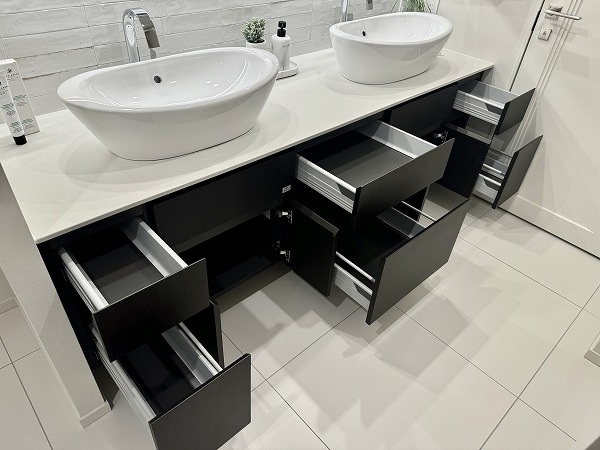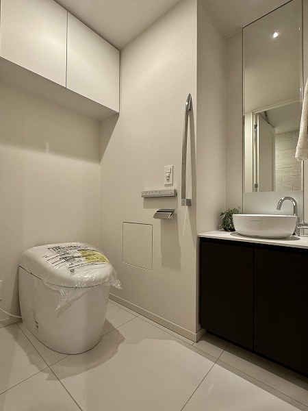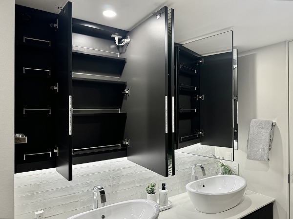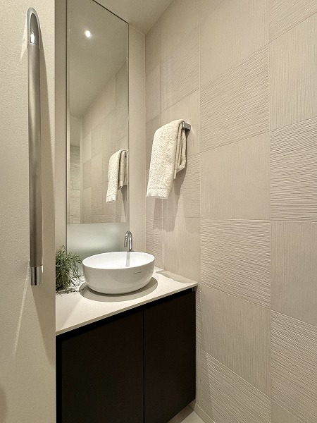ゆとりを感じさせるサニタリールームには、2ボウルタイプの洗面化粧台を設置。ホテルライクな佇まいと実用性を兼ね備え、日常の支度時間を快適に演出します。細かなアイテムまで整理できる収納力もあり、水回りを清潔に保ちやすい設計に。