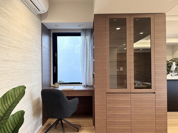LDKの一角に設けられたDENは、暮らしに+αの価値をもたらす空間。造作の収納棚があるため作業道具をまとめやすく、空間を美しく保てます。窓からの柔らかな光を感じながら仕事に集中したり、趣味の時間を楽しんだりと使い方は自由自在。