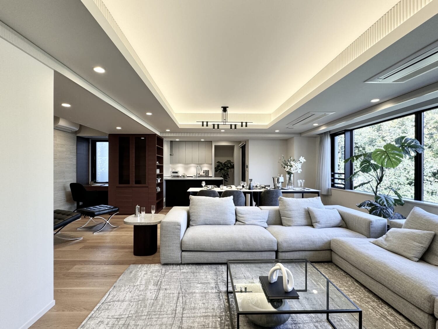 約34.4帖の広さを誇るリビングダイニングキッチンは、この住まいを象徴する開放的な空間。大型のソファやゆったりとしたダイニングセットを配置しても動線に余裕があり、窮屈さを感じさせません。さらに床暖房を完備しているため、寒い季節でも足元からやさしい暖かさに包まれ家族が自然と集まる心地よいリビングが叶います。