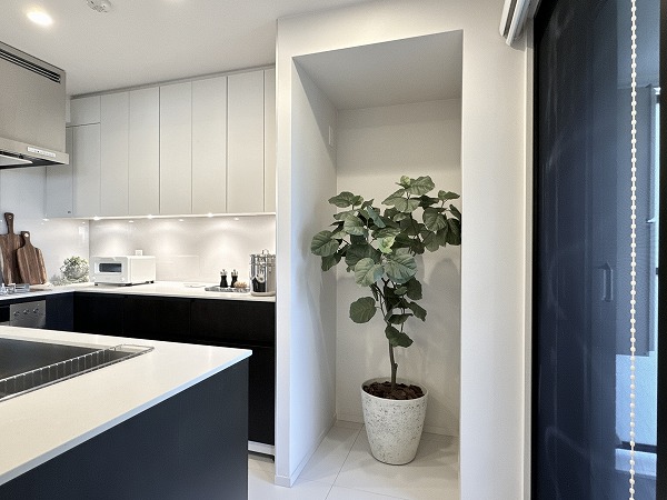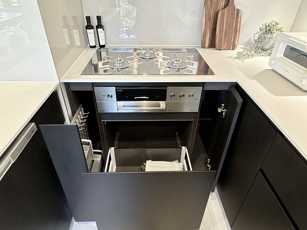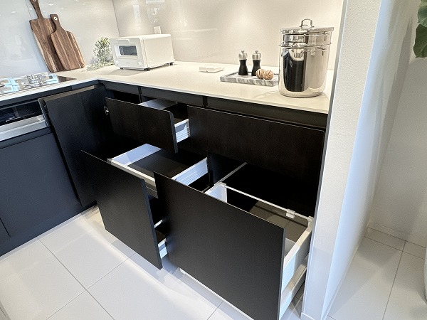 広々としたワークトップが魅力のコの字型キッチン。下部収納も豊富で、調理器具や食器類をすっきりと収めることが可能。作業効率を考えたレイアウトにより、毎日の料理がスムーズに◎使い勝手の良さが、暮らしの満足度を高めてくれますよ。